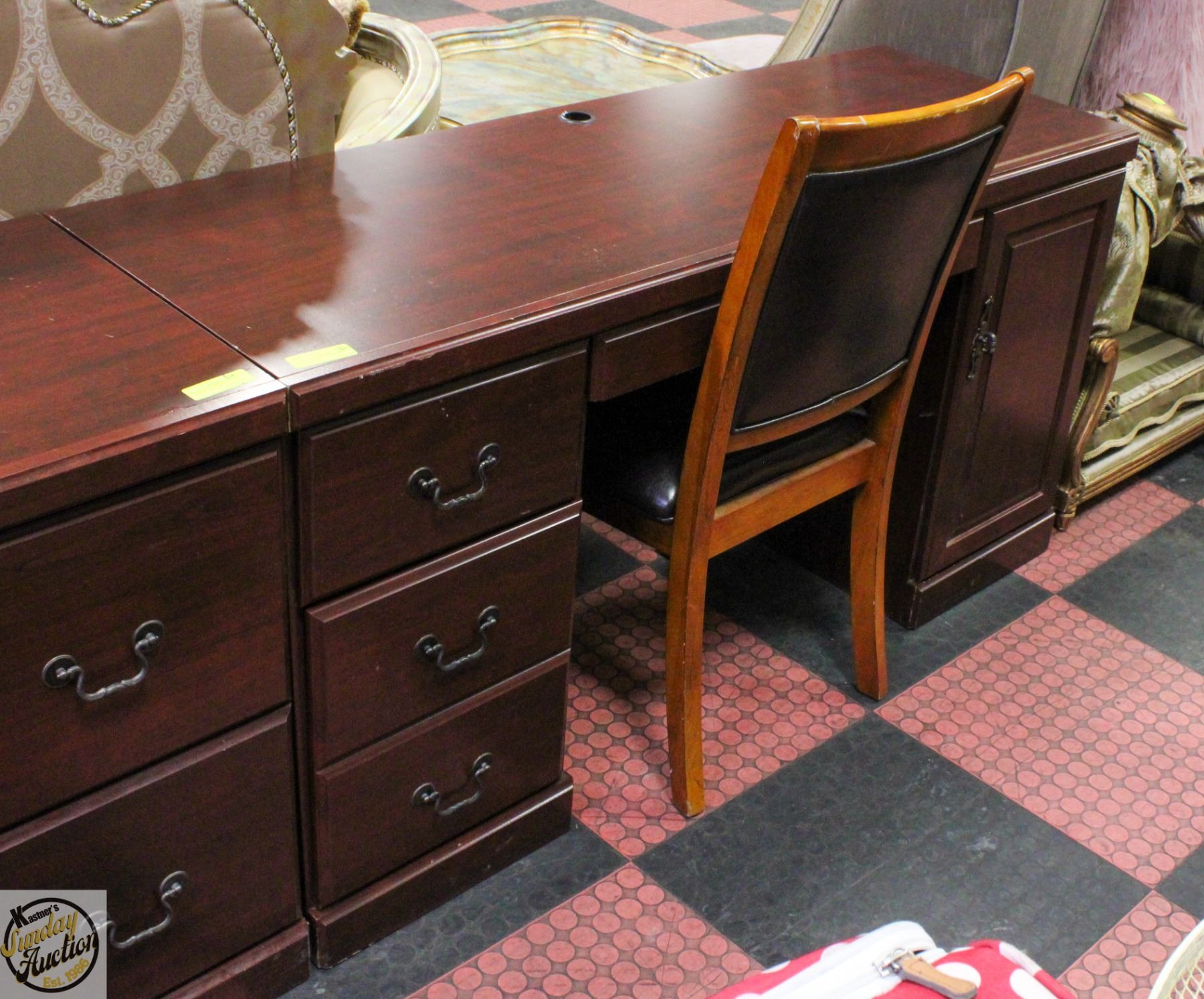 KEYBOARD DRAWER, FILE DRAWER, STORAGE/COMPUTER CABINET INCLUDES SOLID WOOD PADDED LEATHER CHAIR (DESK MEASURES 59"L X 21"W X 30"H) **ALL ITEMS MUST BE REMOVED BY 5PM SATURDAY, FEBRUARY 7TH 2025. ALL REMAINING ITEMS WILL BE SUBJECT TO A $6.00 PER DAY STORAGE CHARGE. ANY ITEMS REMAINING AFTER MONDAY, FEBRUARY 23RD 2025 WILL BE CONSIDERED FORFEITED. NO REFUNDS WILL BE ISSUED FOR FORFEITED ITEMS. TO SCHEDULE A PICK UP APPOINTMENT CLICK HERE