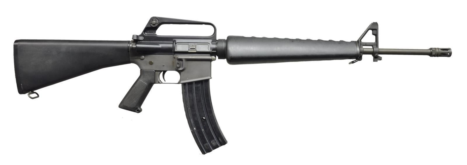 Cal. 5.56mm. S# EA.28227. Bbl. 20". Classic SP1 configuration build on an early EA Co. lower receiver. Receiver finish is midrange gray which is correct. Dark black upper receiver is an SP1 style w/ carry handle & windage adj. peep sight. No brass deflector, rnd. forward assist. Beaver tail triangular handguards & original style front sight/bayonet lug/gas block. Straight wall delta ring. Pencil bbl. terminated w/ A2 flash hider & marked “4T663 MP CHROME BORE”. Sling swivels front & rear. Full length A2 style buttstock w/ trapdoor. M16 bolt carrier. MAGS: 1 40 rd. CONDITION: all of the EA Co. based firearms are custom builds, this one utilizing a combination of A1 & A2 hardware. The contrast between the dark black upper & gray lower is something easily recognizable to longtime fans of the black rifle. All parts were originally sourced from other firearms before being assembled in this configuration & wear as well as markings are normal for builds such as this. Bolt hold open lever sticks slightly, but is still functional w/ persuasion. Bore is shiny w/ visible rifling. Fire control mechanism appears to function correctly when cycled by hand. (21-507/JZ). MODERN. $500-900.