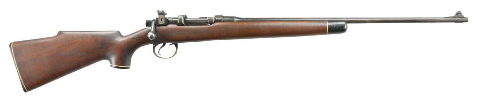 ACTION RIFLE. Cal. 303 Brit. S# C15566. Bbl. 25.2" w/ a Lyman ramp white bead front sight & Lyman Lee receiver sight. British WWI SHTLE action stamped w/ various British proofs. Mag is alter to blind box configuration w/ floorplate installed over mag. well. Replacement walnut stock set w/ Monte Carlo roll over cheekpiece buttstock. having black forearm tip, grip cap & buttplate w/ white line spacers. CONDITION: good overall w/ light handling marks. Reblued metal finish fading to brown patina overall. Very good stock finish. Good bore. (22-1234/MD). MODERN. $200-300.