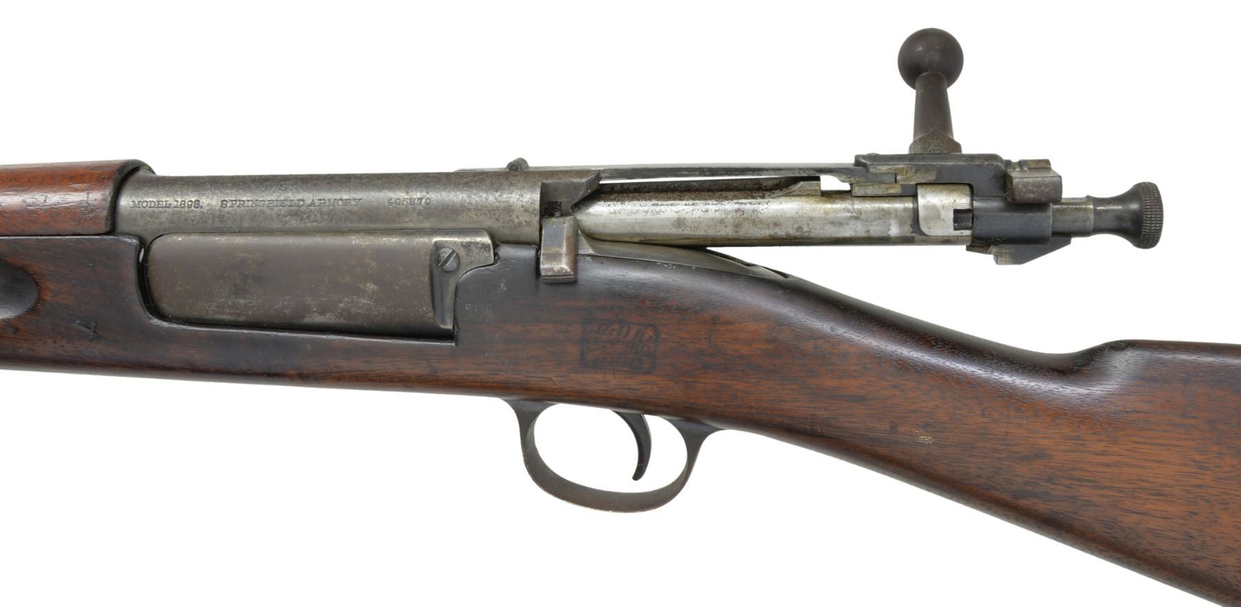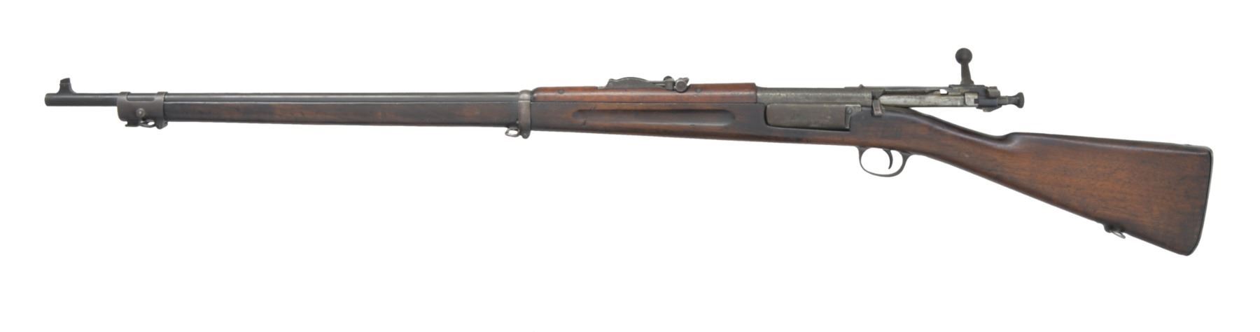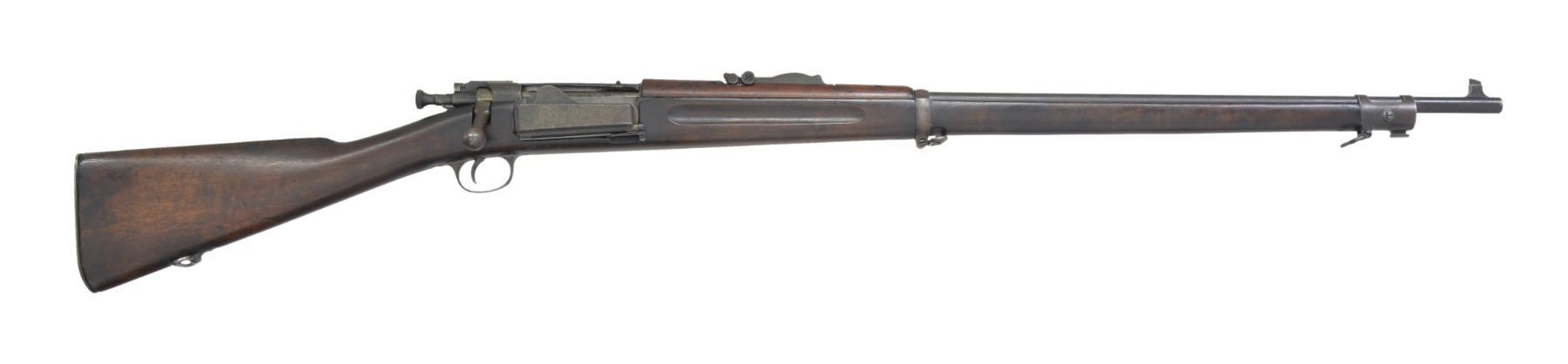 Cal. 30-40 Krag. S# 405870. Bbl. 30". Pinned blade front sight w/ Model 1902 graduated leaf rear sight. Finger groove rifle stock w/ Type 5 handguard & trapdoor buttplate. Right side of stock has partially visible "JSA" cartouche having 1900 date. UNATTACHED ACCESSORIES: signed letter from Lt. Col. Brophy's daughter regarding this lot. CONDITION: bbl. finish has faded to brown. Action finish has faded to a mottled gray brown patina. Stock is heavily sanded & refinished, rounded at buttplate having sm. chips at buttplate & along bbl. channel w/ hairline crack behind top tang. Bore has slightly darkened appearance retaining some rifling. PROVENANCE: From the collection of Lt. Col. William S. Brophy. (19-5584/DS). CURIO. $700-1,000.