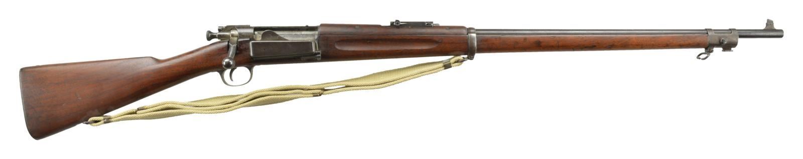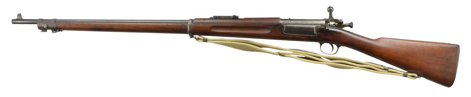 Cal. 30-40 Krag. S# 253302 Bbl. 30" w/ pinned blade front sight & 2,000 yd. leaf rear sight. Band fastened full length stock w/ grasping grooves, walnut handguard & trapdoor steel buttplate. Web sling on original swivels. UNATTACHED ACCESSORIES: four piece cleaning kit held in butt compartment & canvas muzzle cover. 1902 Dated Bayonet & Scabbard in fair overall condition. CONDITION: bbl. is dull blue fading to brown showing light pitting & handling marks. Action finish has faded to a mottled gray/brown. Sanded & refinished stock shows wear & age darkening w/ scattered scratches & marks. Dark bore w/ worn rifling. PROVENANCE: from the estate collections of Charles P. Obremski. (22-1319/DS). CURIO. $400-600.