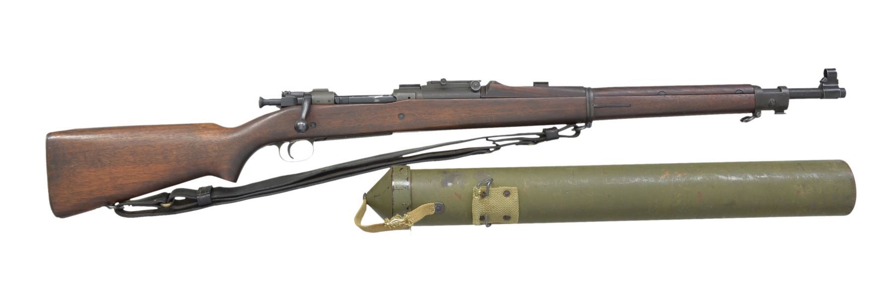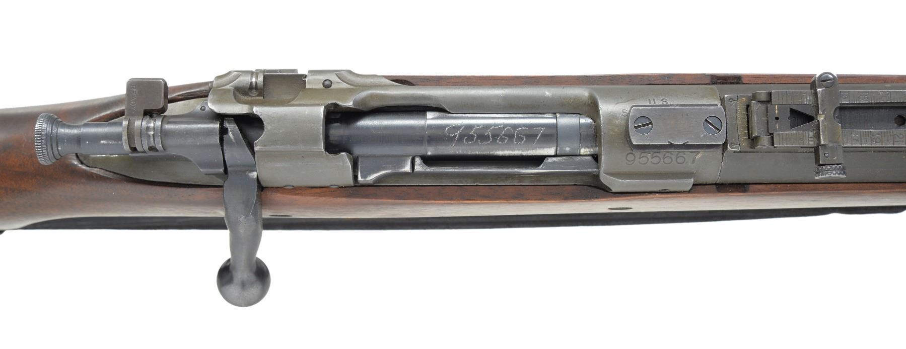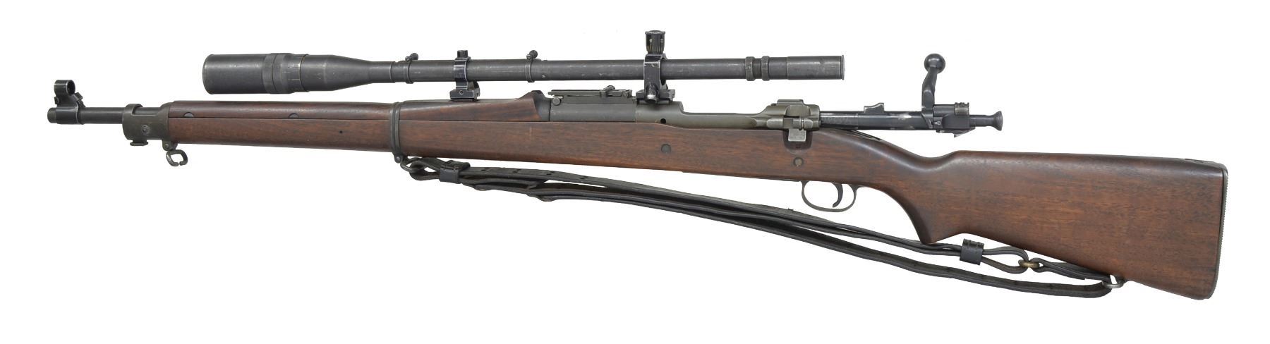 Cal. 30-06. S# 955667. Extremely scarce original World War II era Sniper set w/ scope, scope carrier, correct sling & front sight cover. Rifles were assembled at the Marine Depot in Philadelphia, Pennsylvania as a replacement for the earlier Models using the Lyman 5A telescopic sight. According to "the Model 1903 Springfield Rifle" by Joe Poyer, early models were assembled from National Match rifles, but later models were made from selected 1903A1 rifles. The Unertl scope was recommended for adoption by Marine Corp. Equipment Board after studying various telescopes under field conditions. The sniping combination served in WWII & the Korean conflict until it"s eventual replacement by the M1 Garand Sniper rifle. This rifle has a 24" bbl. marked "SA" flaming bomb "7-42". Late production Remington bolt electro penciled to match S#. Ladder rear sight graduated to 2,850 yds. Dished elevation & windage knobs. Moveable base is marked "R". Fixed sight base made w/out lightening cuts. Blade front sight w/ sheet metal sight protector. Receiver ring & bbl. fitted w/ dovetail scope bases 7.2" on center. All milled furniture. Checkered National Match trap buttplate. National Match type serrated trigger. US 1907 sling marked "J.C.S. CO. C.E.B.". Receiver bridge has been drilled & tapped on right sight for Lyman sight. Matching walnut "C" stock w/ 2 recoil bolts. Stock is unmarked except for "S" in cutoff recess, indicating mfg. by Springfield Armory. Rifle includes correct Unertl 8x power target telescope w/ 3/4" tube. Scope was supplied w/out recoil spring due to concerns that sand from beaches working under the spring could score the tube. Has correct 2nd ring behind front mt. Mounts are blackened duralumin. Scope has AO & screw in lens caps. Fine crosshair reticle w/ dot. UNATTACHED ACCESSORIES: nickel plate oiler in butt. Screw in lens caps for scope. Includes extremely rare Micarta carrying case w/ quick detachable cap retains by strap. Case has inside spring loaded conical mount for objective scope bell. CONDITION: original finish stock set has very nice appearance w/ scattered sm. handling marks. Height reduction of handguard appears to be correctly machine done. Rectangular mortise for forward scope dovetail shows hand type fitting. Metal parts show very lg. % of wartime parkerizing w/ greenish shades, except bolt which is black & shows light wear patterns. Near excellent shiny bore. Scope retains 60% dark parkerized finish w/ thinning, light wear & scattered very fine pitting. Optics are serviceable, but slightly cloudy. Ocular lens has slightly separated appearance. Scope case has thinning OD green paint, but is in otherwise good serviceable condition. There is an approx. 1" abrasion w/ losses on web retaining strap. Rifle sling has light wear & flexing. (20-901/RW). CURIO. $10,000-15,000.