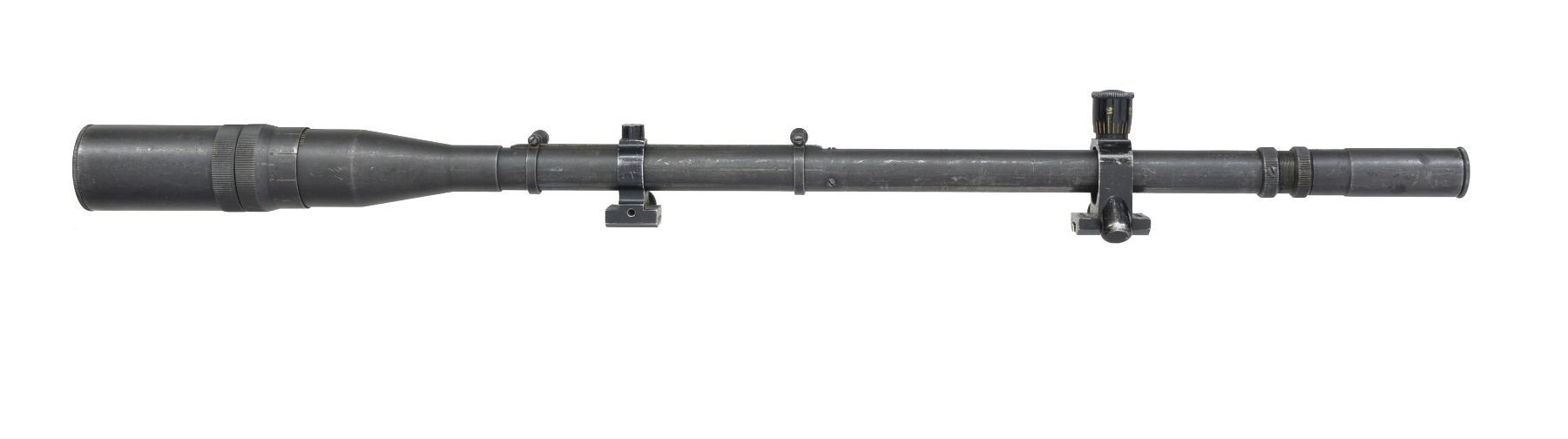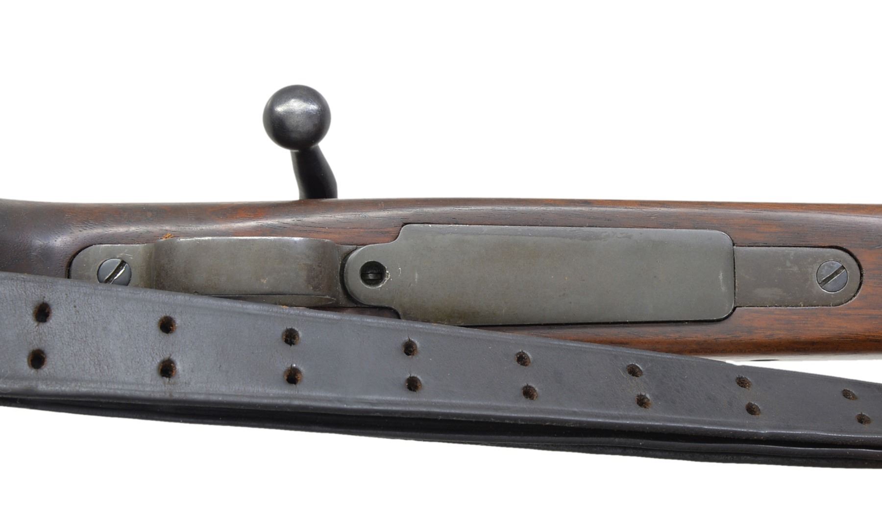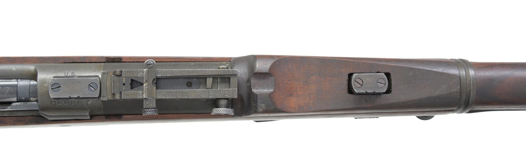 Cal. 30-06. S# 955667. Extremely scarce original World War II era Sniper set w/ scope, scope carrier, correct sling & front sight cover. Rifles were assembled at the Marine Depot in Philadelphia, Pennsylvania as a replacement for the earlier Models using the Lyman 5A telescopic sight. According to "the Model 1903 Springfield Rifle" by Joe Poyer, early models were assembled from National Match rifles, but later models were made from selected 1903A1 rifles. The Unertl scope was recommended for adoption by Marine Corp. Equipment Board after studying various telescopes under field conditions. The sniping combination served in WWII & the Korean conflict until it"s eventual replacement by the M1 Garand Sniper rifle. This rifle has a 24" bbl. marked "SA" flaming bomb "7-42". Late production Remington bolt electro penciled to match S#. Ladder rear sight graduated to 2,850 yds. Dished elevation & windage knobs. Moveable base is marked "R". Fixed sight base made w/out lightening cuts. Blade front sight w/ sheet metal sight protector. Receiver ring & bbl. fitted w/ dovetail scope bases 7.2" on center. All milled furniture. Checkered National Match trap buttplate. National Match type serrated trigger. US 1907 sling marked "J.C.S. CO. C.E.B.". Receiver bridge has been drilled & tapped on right sight for Lyman sight. Matching walnut "C" stock w/ 2 recoil bolts. Stock is unmarked except for "S" in cutoff recess, indicating mfg. by Springfield Armory. Rifle includes correct Unertl 8x power target telescope w/ 3/4" tube. Scope was supplied w/out recoil spring due to concerns that sand from beaches working under the spring could score the tube. Has correct 2nd ring behind front mt. Mounts are blackened duralumin. Scope has AO & screw in lens caps. Fine crosshair reticle w/ dot. UNATTACHED ACCESSORIES: nickel plate oiler in butt. Screw in lens caps for scope. Includes extremely rare Micarta carrying case w/ quick detachable cap retains by strap. Case has inside spring loaded conical mount for objective scope bell. CONDITION: original finish stock set has very nice appearance w/ scattered sm. handling marks. Height reduction of handguard appears to be correctly machine done. Rectangular mortise for forward scope dovetail shows hand type fitting. Metal parts show very lg. % of wartime parkerizing w/ greenish shades, except bolt which is black & shows light wear patterns. Near excellent shiny bore. Scope retains 60% dark parkerized finish w/ thinning, light wear & scattered very fine pitting. Optics are serviceable, but slightly cloudy. Ocular lens has slightly separated appearance. Scope case has thinning OD green paint, but is in otherwise good serviceable condition. There is an approx. 1" abrasion w/ losses on web retaining strap. Rifle sling has light wear & flexing. (20-901/RW). CURIO. $10,000-15,000.