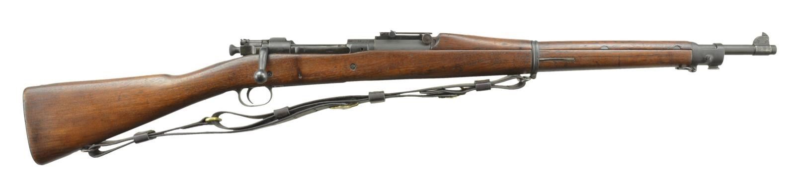 Cal. 30-06. S# 557930. Bbl. 24" marked "SA" over flaming bomb w/ "4-42" date. Blade front sight w/ 2,700 yd. Remington graduated leaf rear sight. Milled triggerguard & floorplate. Type S walnut stock & handguard. Left side of stock has "RA" rebuild mark over letters "LB". Toeline behind triggerguard has circle "P" firing proof. Military leather sling on original swivels. WWI era rifle, rebuilt during WWII. UNATTACHED ACCESSORIES: US M1 bayonet w/ M7 scabbard in fair sharpened condition. CONDITION: parkerized finish has faded to dark patina w/ scattered light corrosion. Stock has dark worn appearance showing scratches & handling marks. Handguard has chip at left side forward of rear sight. Bore is bright w/ sharp rifling. PROVENANCE: from the estate collections of Charles P. Obremski. (22-1342/DS). CURIO. $400-600.