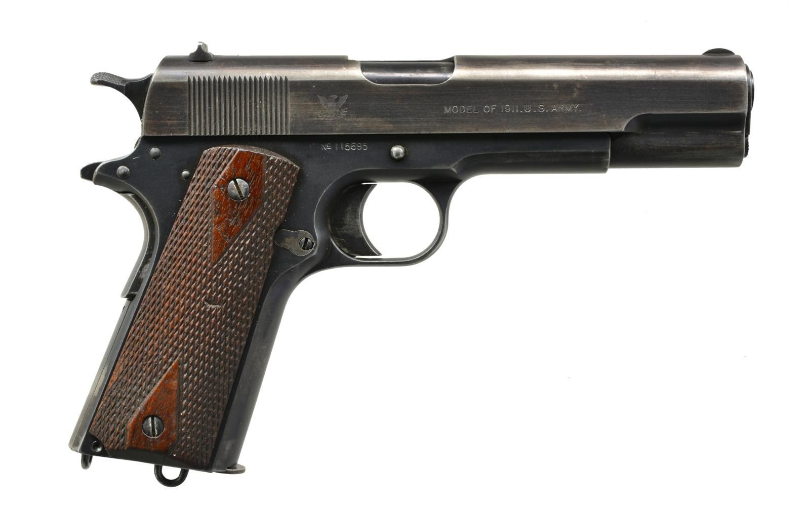 Cal. 45 ACP. S# 115695. Bbl. 5" marked "P" on left side of leg & "S" on right side of leg. Springfield Armory marked slide having Ordnance bomb w/ bullseye inside cannonball behind serrations. Left side of frame marked "UNITED STATES PROPERTY" & Ordnance bomb w/ bullseye inside cannonball above mag. release. Firing pin stop is properly rounded on the upper rear edge. Bbl. bushing, firing pin stop & extractor marked "S". Hammer is unmarked. Grip safety marked "G". Diamond checkered walnut grips. Proper blue/black rust blued finish. MAGS: 1 two tone 7 rd. w/ sides of body wrapped under base having lanyard ring. UNATTACHED ACCESSORIES: repro. Model 1911 storage box w/ wax paper. CONDITION: over 80% original blue showing fading on slide & edges. Grips show moderate wear. Bore is bright w/ strong rifling. (20-1936/DS). CURIO. $3,500-5,000.