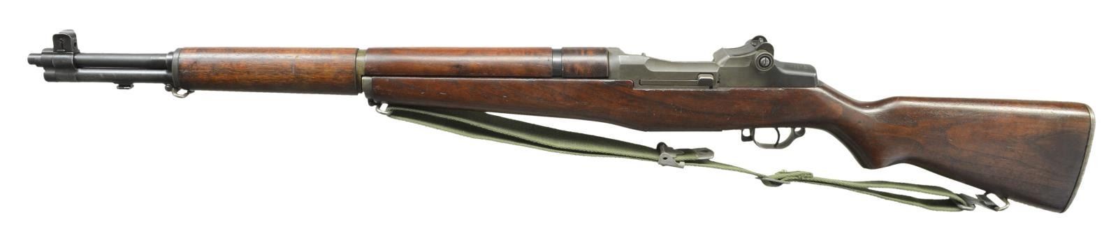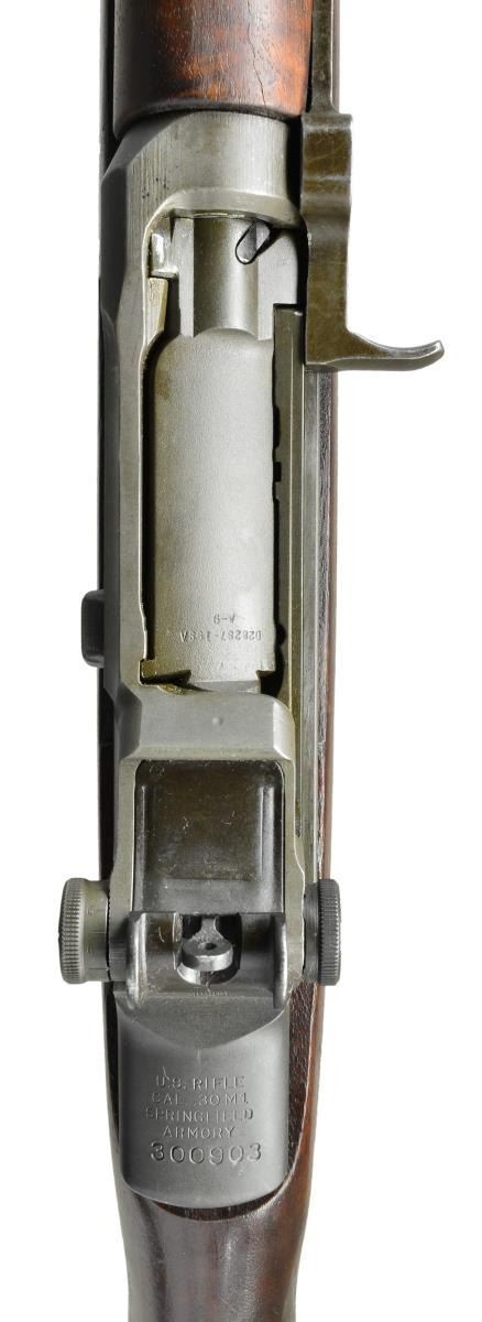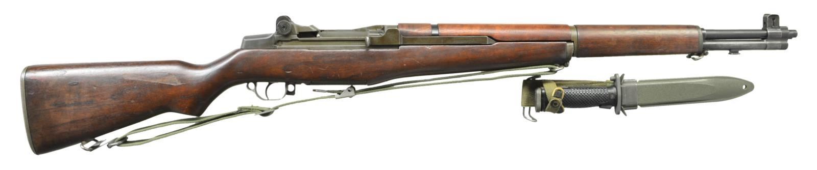 Cal. 7.62 NATO. S# 300903. Bbl. is Springfield 24" marked "3-66" plus "7.62 MM". Mfg. 3rd. quarter of 1941 (270000-320000). Many upgrade parts from reconditioning; no spacer block in mag. well. Bolt marked "D28287-19SA" over "A-9". Springfield trigger housing w/ WW-II milled guard. DRC marked flush windage knob & serrated elevation knob. Post WW-II cyl. lock for grenade use plus late WW-II production lock screw. M5A1 bayonet marked "MIL PAR COL" having M8A1 sheath. Green canvas sling. Stock w/ "P" & "H" in front of grip plus boxed "RIA / EB" on left of butt. CONDITION: very good metal finish w/ most loss on gas cyl. & buttplate. High point wear & thinning on trigger guard; no pitting. Handling marks on forend; very good forend. Stock w/ handling marks plus gouge on right side. Near excellent bore that gauges 1 at muzzle. PROVENANCE: from the estate collections of Charles P. Obremski. (22-1279/NW). CURIO. $750-1,000.