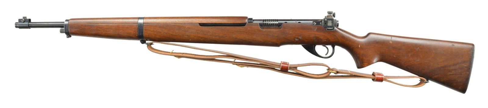 Cal. 22 LR. NSN. Bbl. 24" rnd. Protected blade front sight w/ Redfield receiver sight. Tubular magazine located in forearm. Semi auto action. Rifle is styled to look like the famous M1 Garand. Band fastened full length walnut pistol grip stock & handguard w/ checkered steel buttplate. Modern military style sling on original swivels. CONDITION: 80% lightly faded blue showing spots of corrosion. Original stock & handguard finish shows wear w/ numerous scratches, marks & dents. Bright bore w/ strong rifling. PROVENANCE: from the estate collections of Charles P. Obremski. (22-1264/DS). CURIO. $300-500.