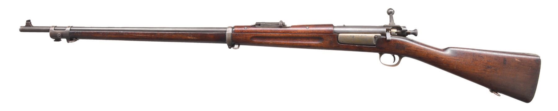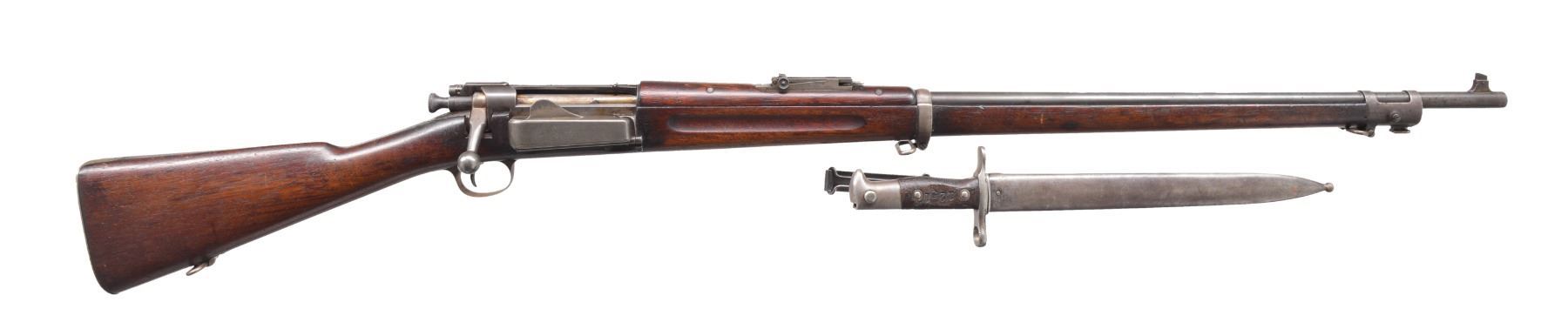 Cal. 30-40 Krag. S# 66709. Bbl. 30". Receiver marked on left side "MODEL 1896". Model 1901 ladder rear sight. Blade front sight. Matching walnut stock set. Smooth trap buttplate w/ curved toe. Boxed illegible cartouche on left side of stock over trigger guard. UNATTACHED ACCESSORIES: 11 5/8" fullered blade bayonet marked on left ricasso "1903", marked on right ricasso "US". Walnut grips. Left grip has been crudely stamped "1251" rack number. Metal turning overall gray w/ scattered spots of light oxidation & sm. dents on crossguard. Blade is noticeably chipped on the edge at midpoint. Steel scabbard w/ belt hanger. Scabbard turning overall gray & patina. CONDITION: stock has moderately worn original finish w/ scattered dents & scratches. Metal turning gray w/ traces of blue & scattered spots of oxidation. Buttplate & sideplate have thinning brass coloration. Very good shiny bore. (01-17379/RW). ANTIQUE. $800-1,200.