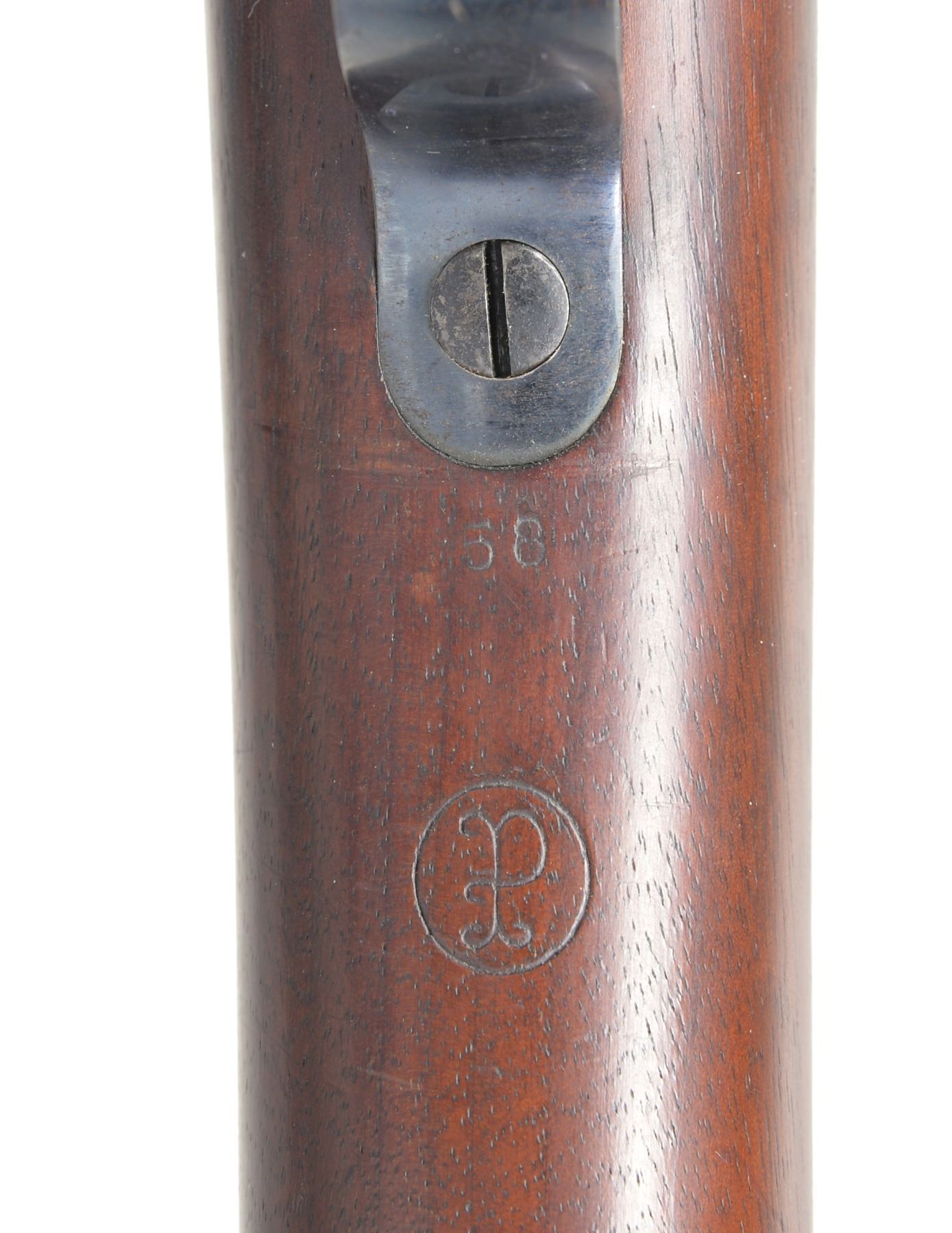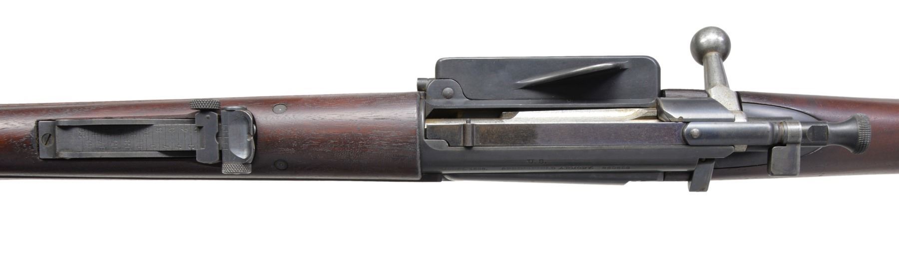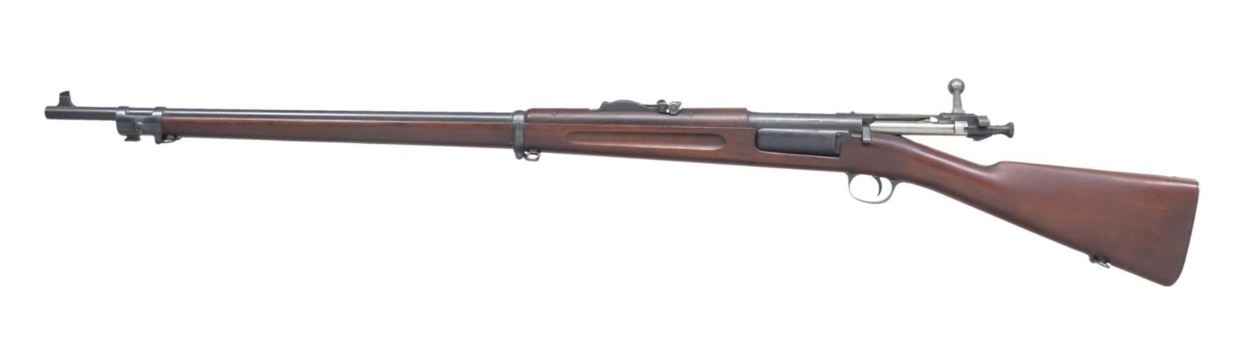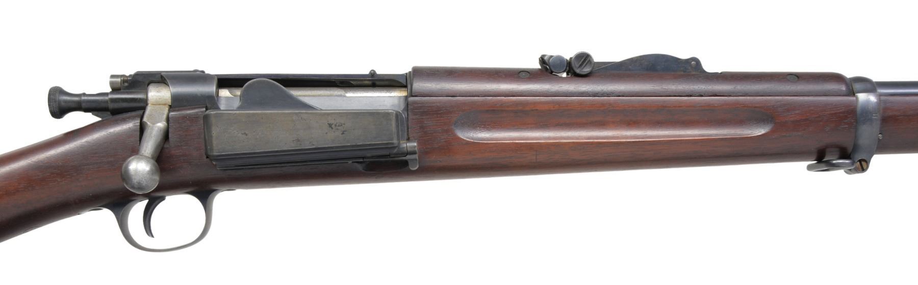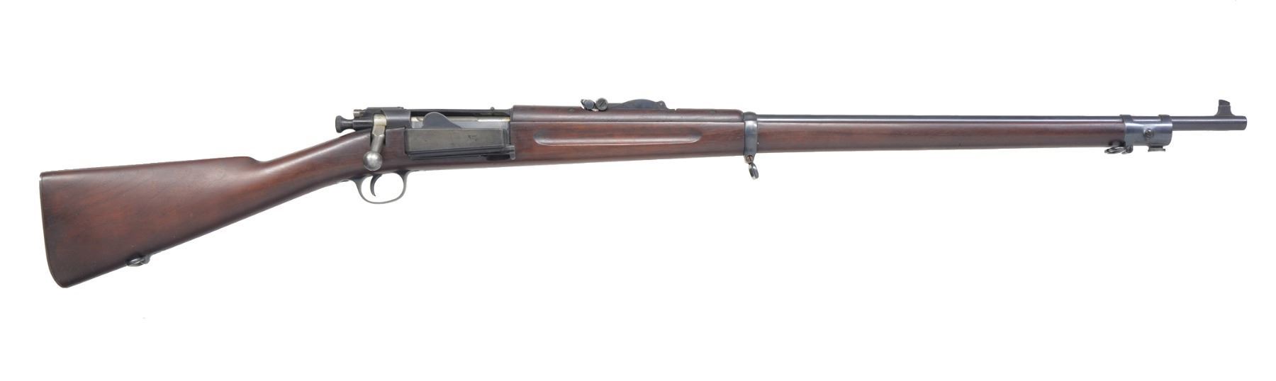Cal. 30-40 Krag. S# 260898. Bbl. 30" w/ pinned blade front sight w/ Model 1902 rear sight. Finger groove stock w/ 5th Type handguard having trap door buttplate & sling swivels. Left side of stock has a crisp "JSA" cartouche dated 1900. CONDITION: bbl. & action retain over 90% dull lightly faded blue. Original stock finish shows scattered handling marks. Bore is bright w/ strong rifling. (19-5463/DS). CURIO. $800-1,200.