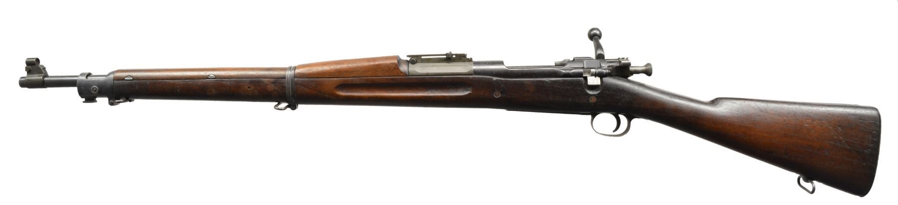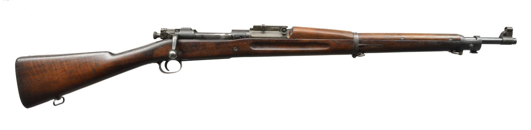Cal. 30-06. S# 447733. Bbl. 24" marked "SA" flaming bomb &"9-09". Straight down bolt handle. Safety lug is marked underneath "S29". Ladder rear sight w/ volley notch graduated to 2,850 yds. Dished elevation & windage knobs. Blade front sight w/ unmarked stamped sight cover. All milled furniture. Later replacement straight grip walnut stock set w/ 2 recoil bolts. Stock has very faint boxed "JFC" & appears "AA" Augusta Arsenal rework marking. Smooth trap buttplate. CONDITION: buttstock has light wear, staining & scratches w/ early arsenal rework type finish. Handguard appears to be original finish. Receiver , floorplate & bbl. appear worn original blue. Trigger guard & rear sight base have latter type parkerized finish. Fair worn bore turning dark in grooves. (20-575/RW). CURIO. $700-900.
