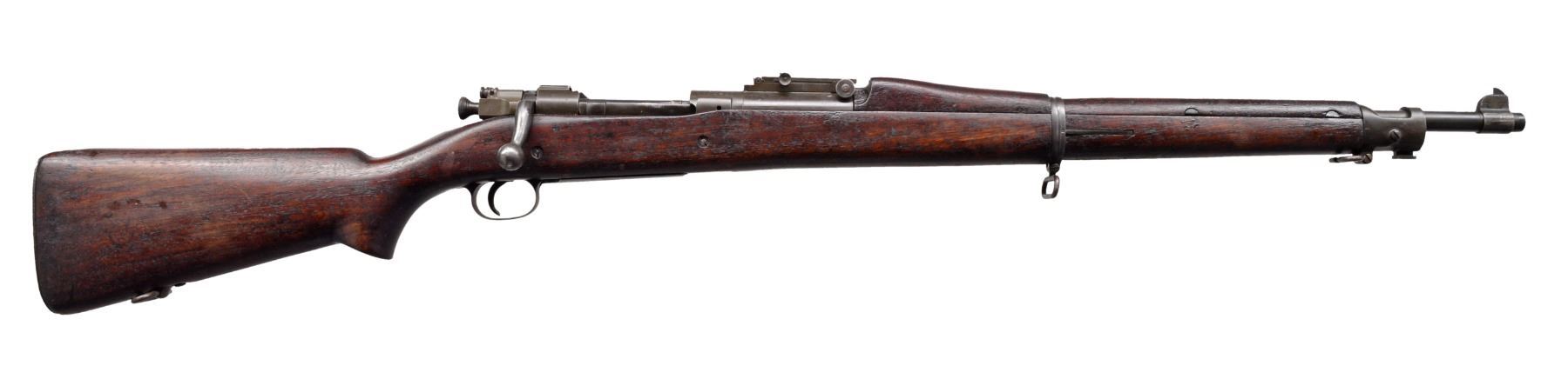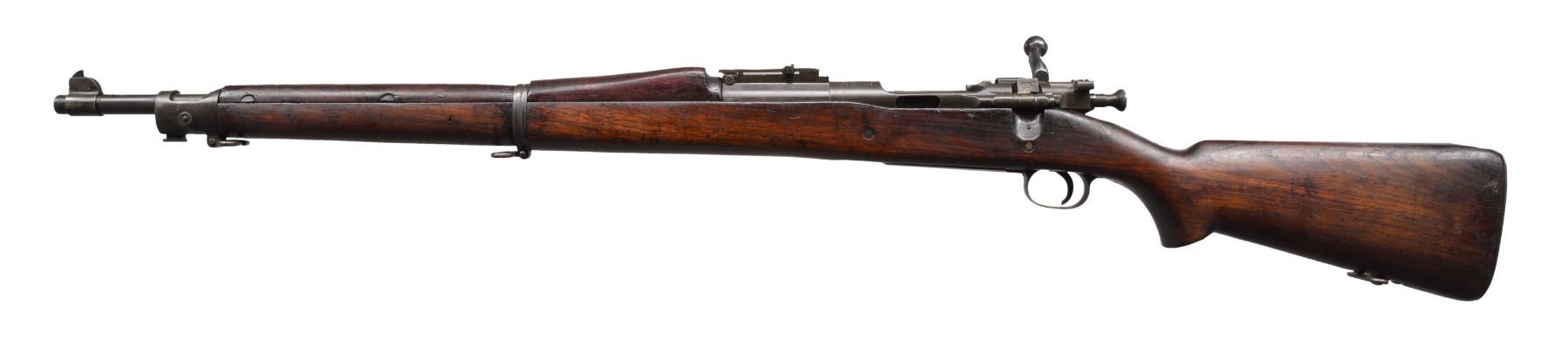 Cal. 30-06. S# 1178257. Replacement 24" bbl. marked behind front sight "SA" flaming bomb & "5-42". Rear sight has flat windage knob marked "R" & dished elevation knob. Rear sight base made w/out lightening cuts & ladder graduated to 2,850 yds. w/out volley notch. Blade front sight. Receiver is marked "U.S. SPRINGFIELD ARMORY MODEL 1903 MARK I". Receiver rail has ejection port for Pederson device. Rifle originally mfg. for use w/ Pederson device, has been given "C" type stock. The stock is unmarked except for "S" in cutoff recess. Trigger & cutoff replaced w/ standard parts. All milled furniture except stamped trap buttplate. 1903 Bolt w/ swept handle. Bolt shroud & safety marked "R". Cutoff is marked "R". Has smooth narrow trigger. CONDITION: stock set has arsenal rework type finish w/ light wear, dents, scratches & moderate staining throughout. Metal has 70% original parkerizing w/ thinning & wear. Good bore w/ worn lands & light frosting in grooves. (19-5812/RW). CURIO. $500-700.