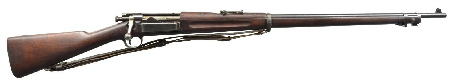 Cal. 30-40 Krag. S# 90360. Bbl. 30". Model 1896 rear sight graduated to 1800yds. Blade front sight. Walnut stock set w/ smooth trap buttplate which contains 3 piece cleaning rod & nickel plated oiler. Stock made w/ flared bolt handle recess. Stock marked on left side w/ faint, boxed “JSA 1894”. Vintage unmarked Krag sling. CONDITION: stock has been lightly refinished w/ light staining, moderate wear, dents & scratches. Notable denting on left side of stock around grasping groove. Metal has 70% original blue finish w/ thinning, light wear & scattered sm. spots of oxidation. Sling has extensive wear, cracking & notable tear at upper swivel. Good shiny bore w/ strong lands. (01-17942/RW). ANTIQUE. $600-900.