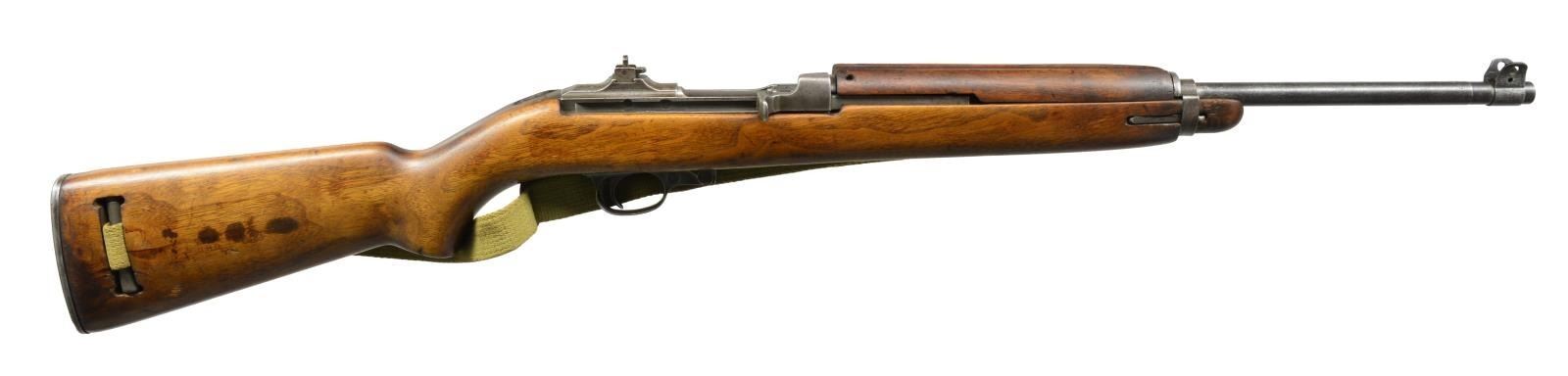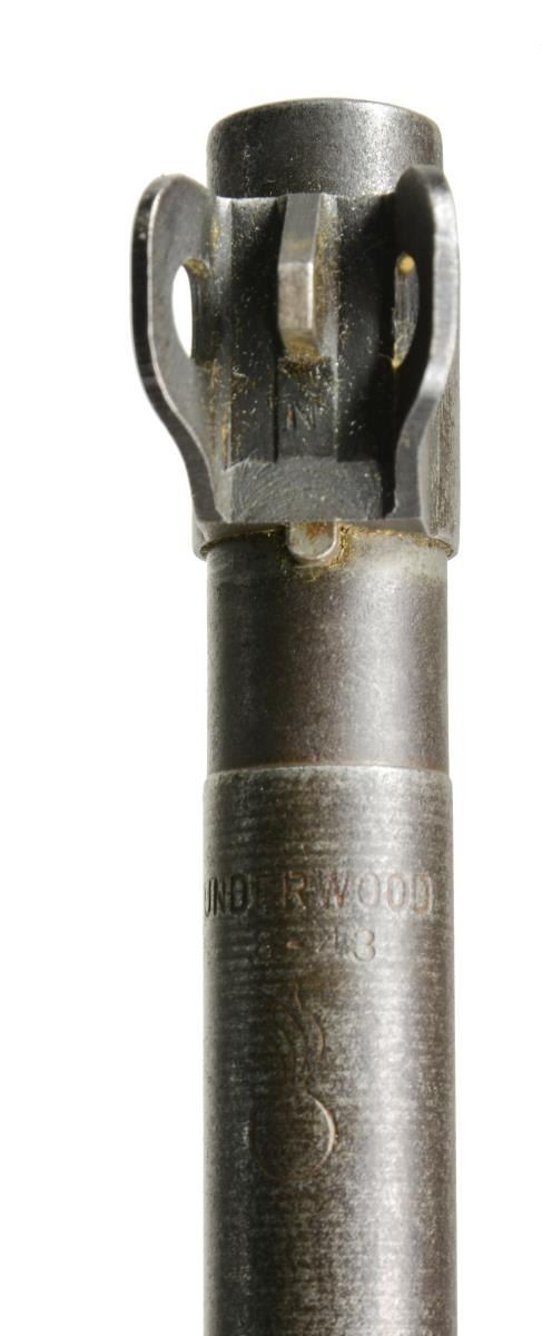 Cal. 30 Carb. S# 2010192. Bbl. 18". Receiver marked on forward left side, below wood line, “6A”. Bbl. is marked behind front sight “UNDERWOOD 8-43” w/ flaming bomb. “L” type flip sight w/ blade front sight & protective ears. Sight retaining pin is not present, as well as sight not being seated fully on bbl. Narrow bbl. band w/ out bayonet lug. Wide aperture sling swivel. Straight cut slide marked inside w/ “.U.”. Milled trigger housing marked w/ “.U.” inside mag. well & flaming bomb ahead of trigger guard. Push button safety w/ smooth button. Mag. release marked “.U.”. Dog leg hammer marked “TH”. Flat bolt marked “UN” on rotation cam. Walnut stock set. High wood “I” cut buttstock has faint, unboxed “WRA / GHD” & crossed cannons. Recoil plate marked “Standard Products”. 2 Rivet handguard has illegible mark. Green web sling. CONDITION: stock set has arsenal rework type finish w/ slight loss of wood, obscuring markings. Metal has traces of original parkerizing turning overall gray w/ areas of light oxidation & very fine pitting. Good, shiny bore w/ lightly worn lands. (20-1928/RW). CURIO. $800-1,200.