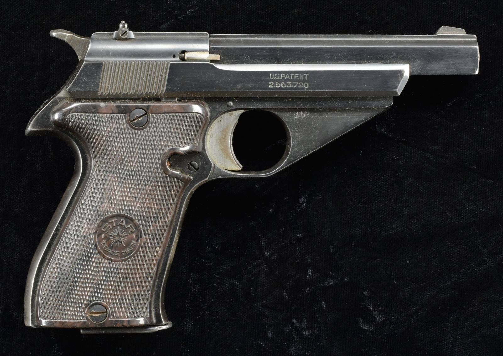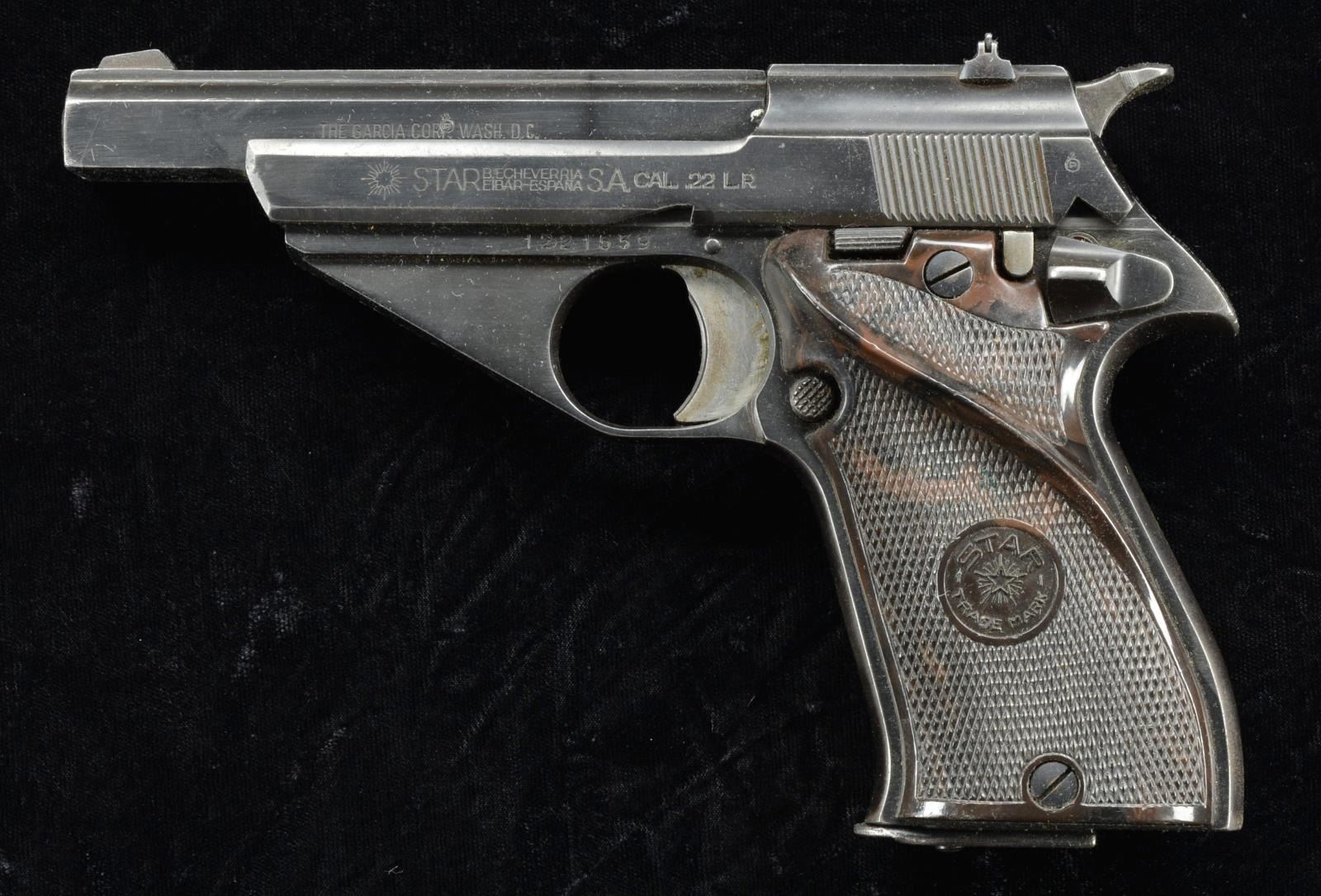 Cal. 22 LR. S# 1221559. Bbl. 4 3/8". Mfg. 1972-1983 in Spain & import marked by Garcia. Similar to FR model w/ heavier frame & web in front of trigger guard. Simulated checkered wood grips w/ RH thumb rest. Integral front sight & windage adjustable rear. MAGS: 1 very good 10 rd. CONDITION: good to very good overall w/ slight thinning of finish plus high point wear. Near excellent bore & grips. PROVENANCE: Estate Collection of Jack Verret Sr. (22-893/NW). MODERN. $250-350.