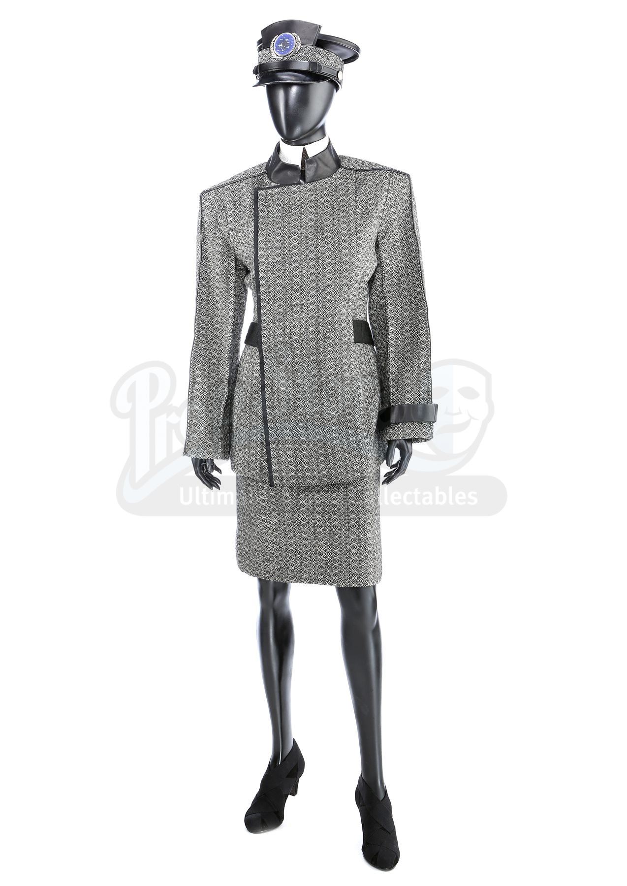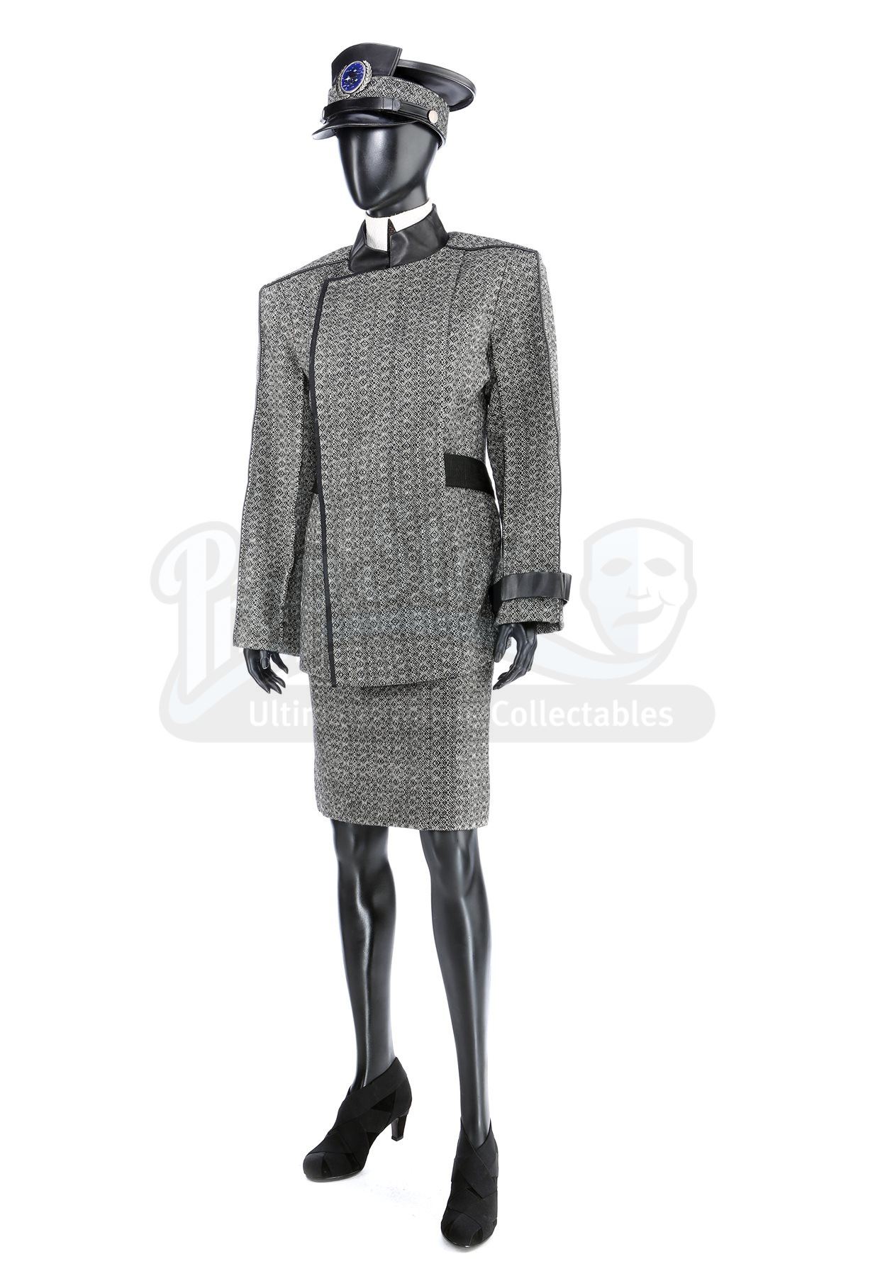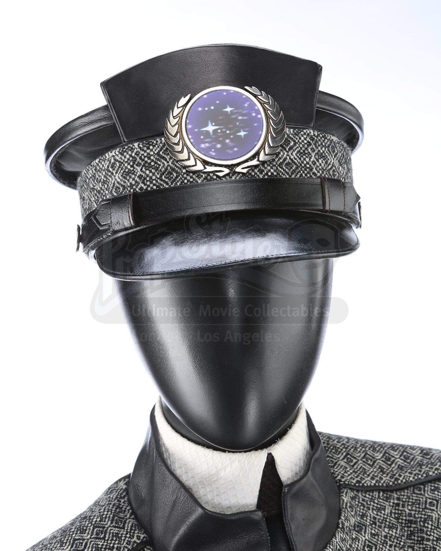 A pair of Starfleet council member uniforms from Star Trek. Starfleet admirals wore their uniforms when Captain Kirk attended a disciplinary hearing for his actions in the Kobayashi Maru simulation. The uniforms include two caps, jackets (marked sizes 42 and 36), hook-and-loop collars, belts, skirt (approximate size small), pants (marked size 36), and a pair of black high heel shoes (Euro 38). The custom-made uniforms are largely made of furniture upholstery fabric with faux leather components. The caps feature a unique leather top that is only attached at the front, with the sides completely open. The fronts of the caps include lenticular Federation pins. The double-breasted jackets feature leather collars and cuffs and sturdy piping at the seams. Both jackets feature one unattached cuff. Estimate: $800 - 1200*Estimated sale price; sold without reserve.
