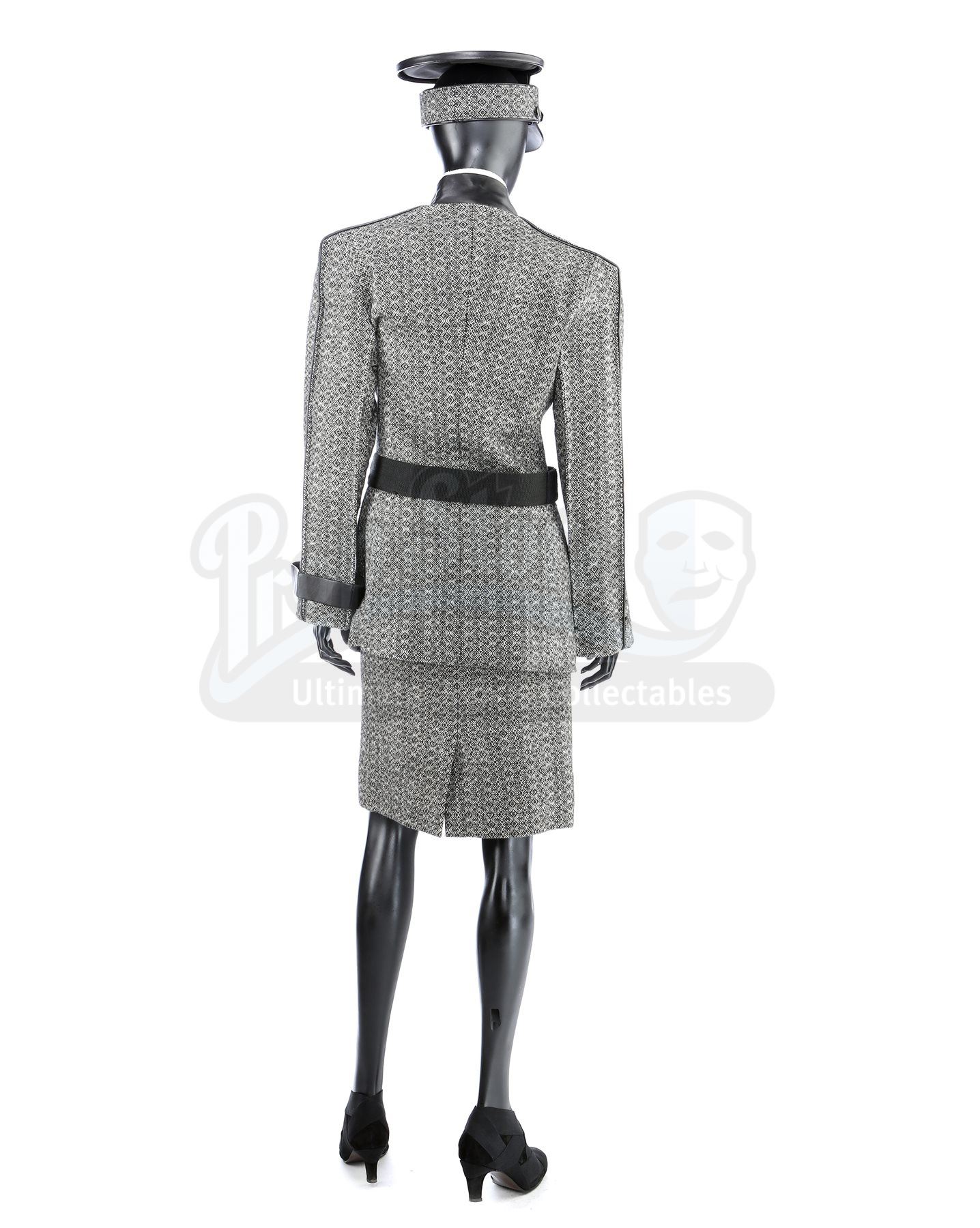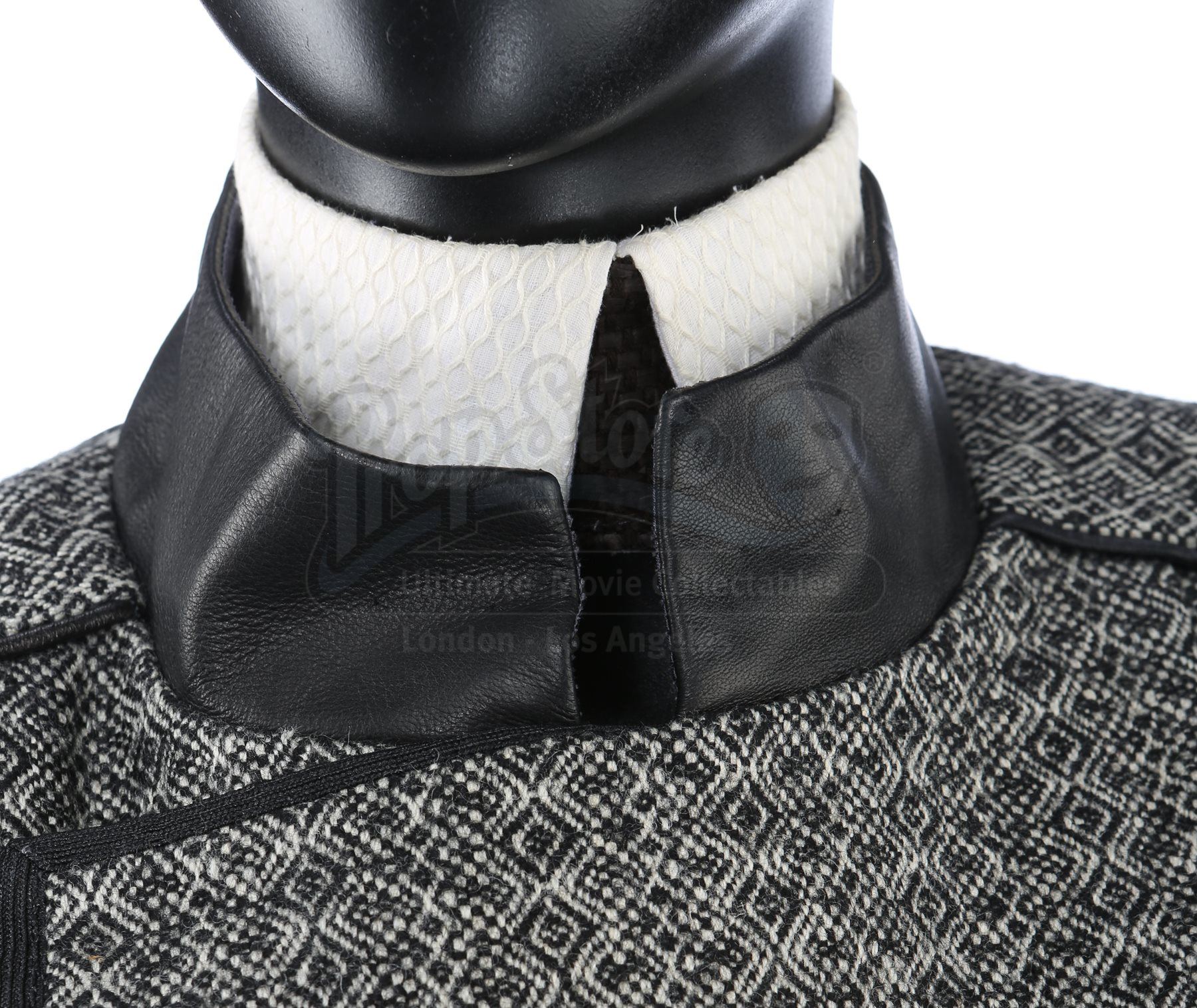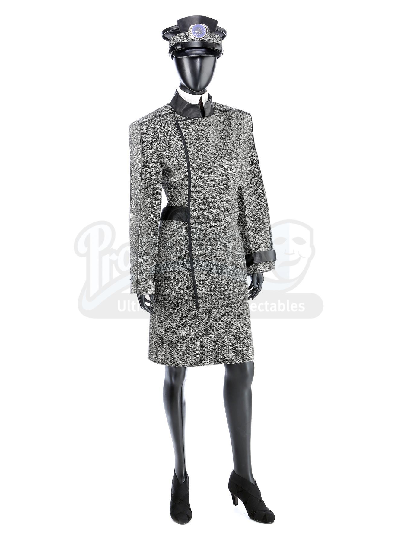 A pair of Starfleet council member uniforms from Star Trek. Starfleet admirals wore their uniforms when Captain Kirk attended a disciplinary hearing for his actions in the Kobayashi Maru simulation. The uniforms include two caps, jackets (marked sizes 42 and 36), hook-and-loop collars, belts, skirt (approximate size small), pants (marked size 36), and a pair of black high heel shoes (Euro 38). The custom-made uniforms are largely made of furniture upholstery fabric with faux leather components. The caps feature a unique leather top that is only attached at the front, with the sides completely open. The fronts of the caps include lenticular Federation pins. The double-breasted jackets feature leather collars and cuffs and sturdy piping at the seams. Both jackets feature one unattached cuff. Estimate: $800 - 1200*Estimated sale price; sold without reserve.