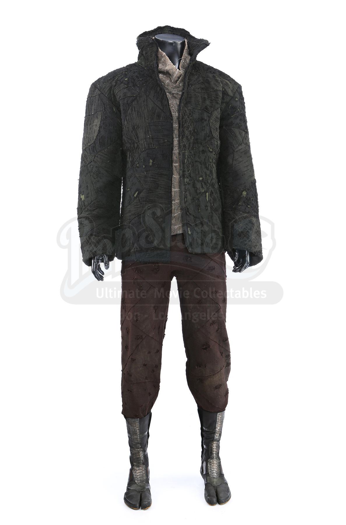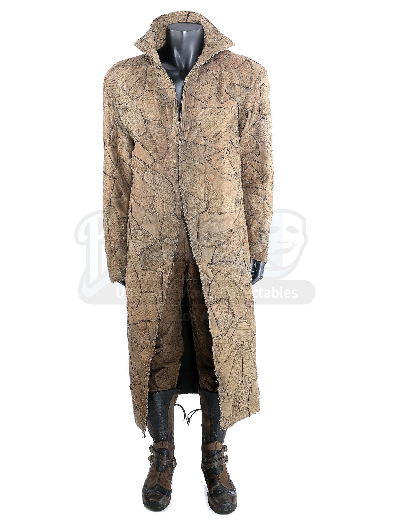 A pair of Romulan costumes from Star Trek. Romulans created an alternate reality when they waged war against the Federation after they were transported back in time. The lot includes long custom-made coats (one size double extra large, one approximate size large), shirt (approximate large), pants (one approximate extra large, one approximate size large), and two pairs of shoes (boots size U.S. 11, tabi shoes approximate size U.S. 9).The costumes were developed using a ragged top-stitched synthetic fabric with frayed edges to reflect the Romulans' work on a mining planet. The floor-length coats feature a wide collars and decorative stitching to create a patchwork of fabric. The interior are lined with cotton and show the Romulan insignia painted just below the back of the neck. Inside the black coat is a strip of tape with a hand-written annotation that reads "100pc Top #25". The shirt features similar top-stitched patchwork fabric that is stitched over a long-sleeved cotton shirt for comfort. The pants feature similar construction and include two rows of snap buttons on both sides of the waist for an adjustable fit. Also included are split-toe tabi shoes with hand-painted leather accents and a pair of leather boots with zippers on the sides. Also included are wardrobe tags with hand-written notes about the costume. Estimate: $1500 - 2000*Estimated sale price; sold without reserve.