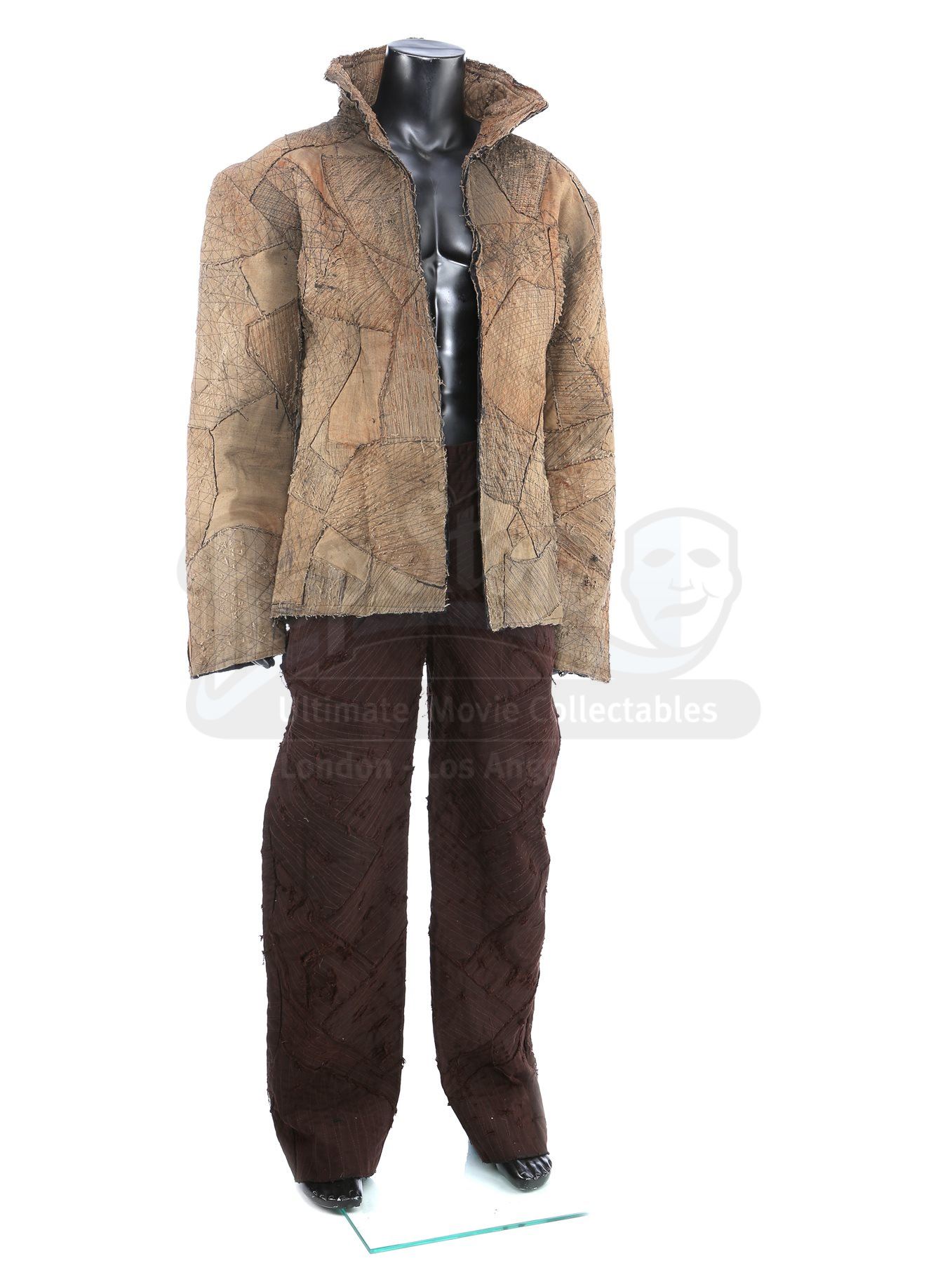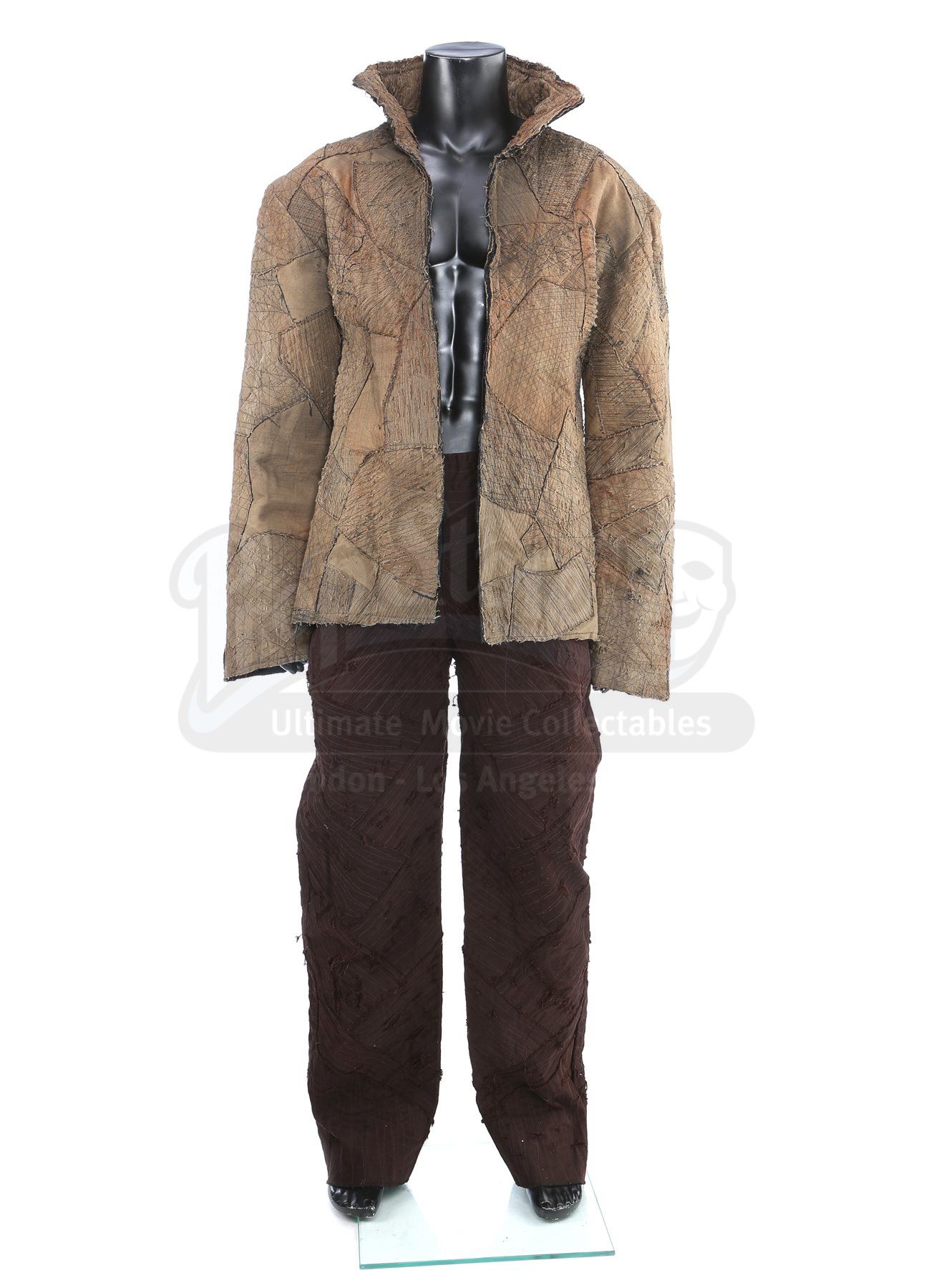A Romulan costume from Star Trek. Romulans created an alternate reality when they waged war against the Federation after they were transported back in time. The costume includes a long custom-made coat (triple extra large) and a pair of pants (approximate size large).The costume was developed using a ragged top-stitched synthetic fabric with frayed edges to reflect the Romulans' work on a mining planet. The black floor-length coat features a wide collar and decorative stitching to create a patchwork of fabric. The interior is lined with cotton and shows the Romulan insignia painted just below the back of the neck. Inside the coat is a strip of tape with hand-written annotation that reads "Stunt #20". The pants feature similar construction and include two rows of snap buttons on both sides of the waist for an adjustable fit. Also included is a wardrobe tag with hand-written notes about the costume.Estimate: $600 - 800*Estimated sale price; sold without reserve.