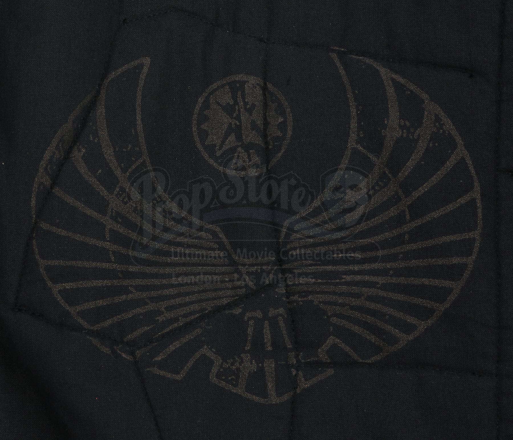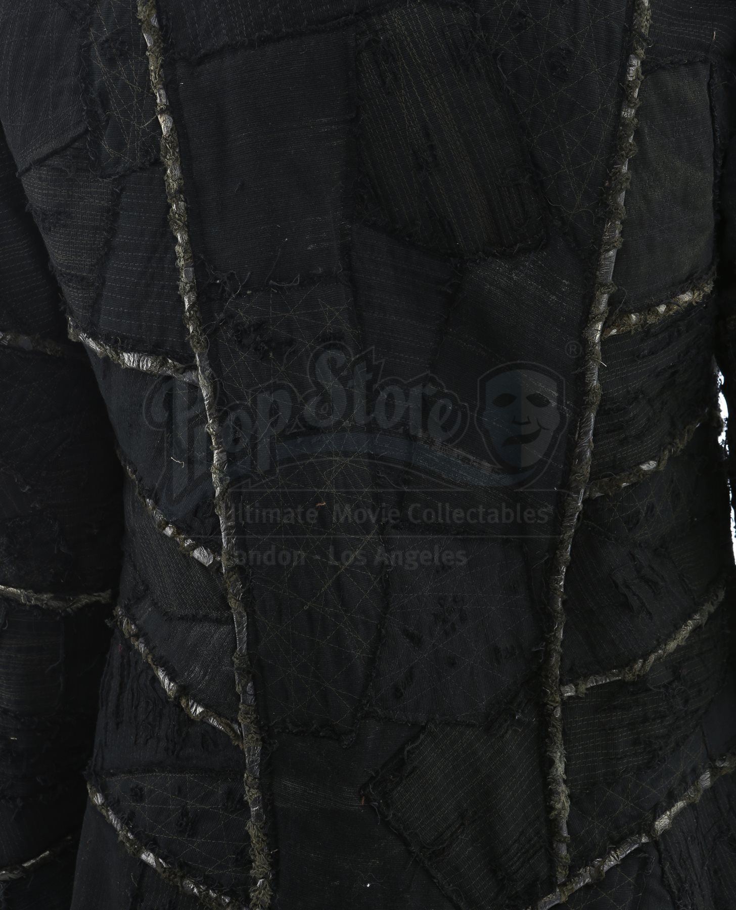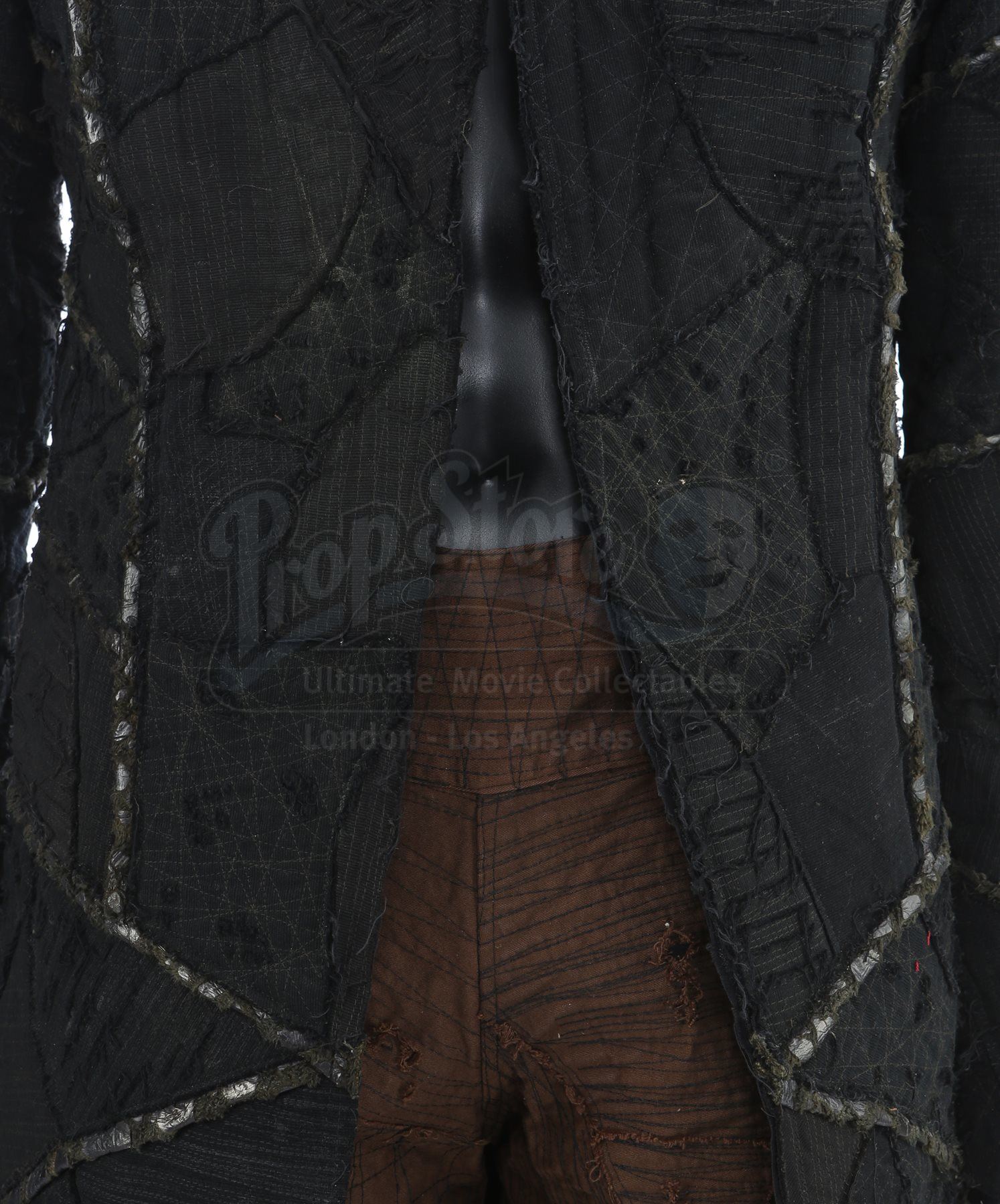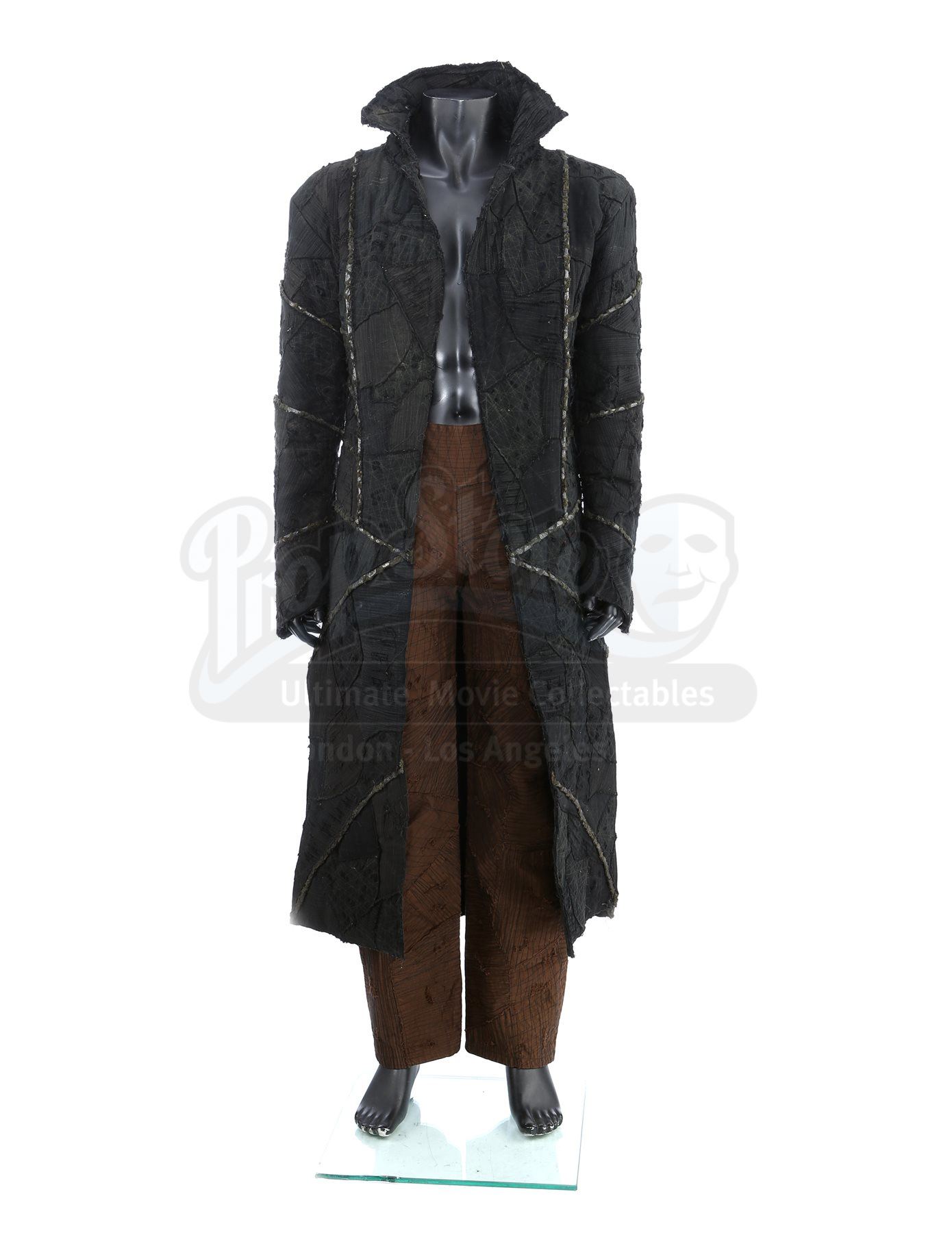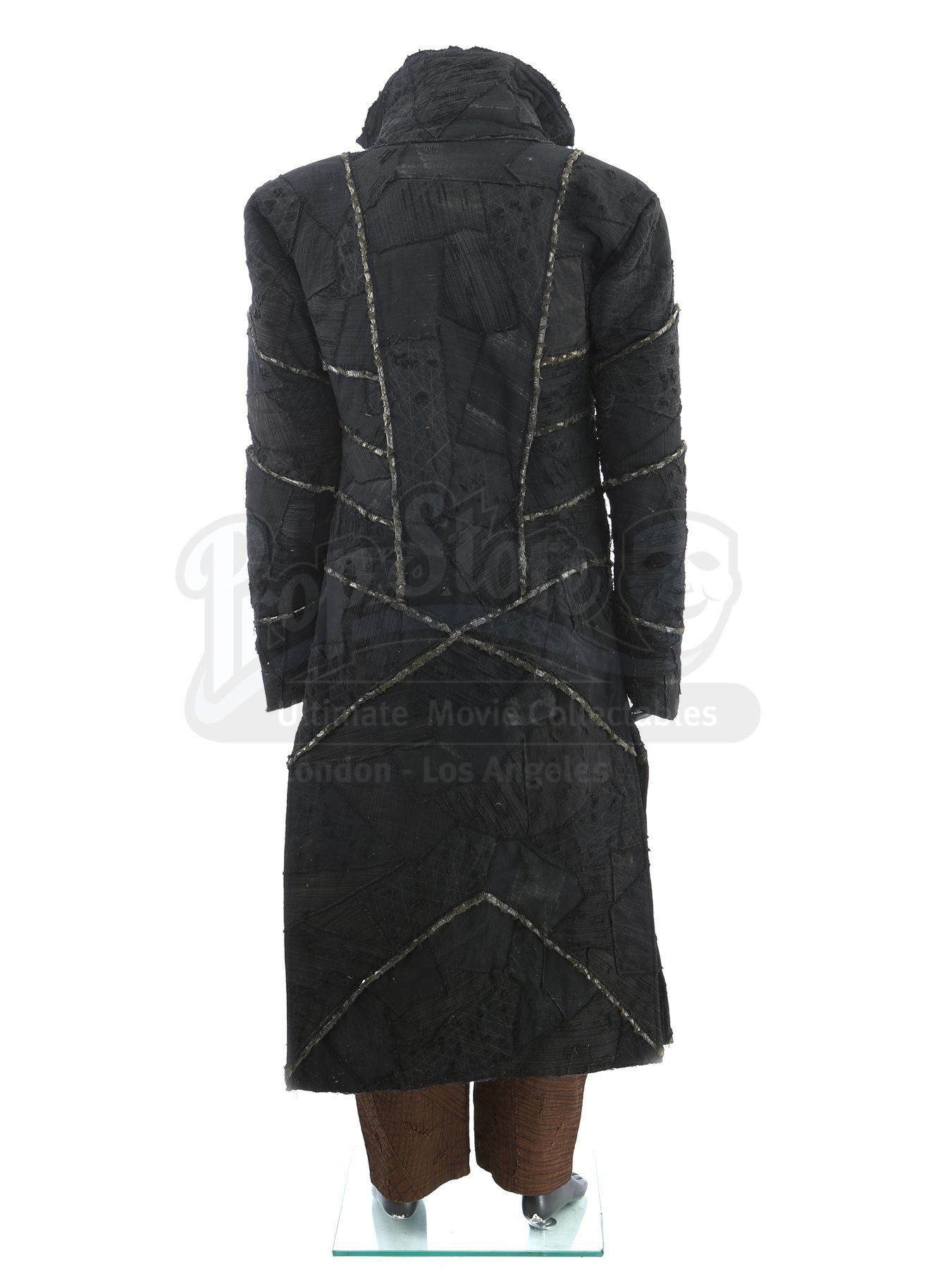 A Romulan costume from Star Trek. Romulans created an alternate reality when they waged war against the Federation after they were transported back in time. The costume includes a long custom-made coat (approximate size large) and a pair of pants (medium).The costume was developed using a ragged top-stitched synthetic fabric with frayed edges to reflect the Romulans' work on a mining planet. The black floor-length coat features a wide collar and decorative stitching to create a patchwork of fabric. The interior is lined with cotton and shows the Romulan insignia painted just below the back of the neck. Stitched inside the coat is a wardrobe label for the actor. The pants feature similar construction and include two rows of snap buttons on both sides of the waist for an adjustable fit. Also included is a wardrobe tag with hand-written notes about the costume.Estimate: $600 - 800*Estimated sale price; sold without reserve.