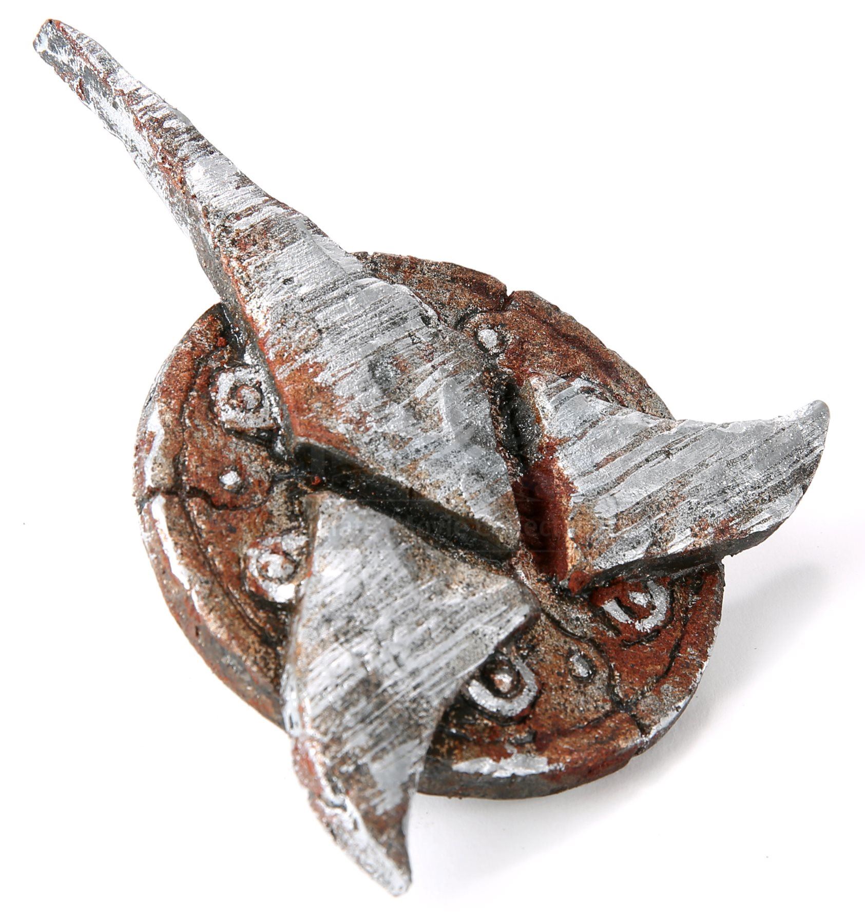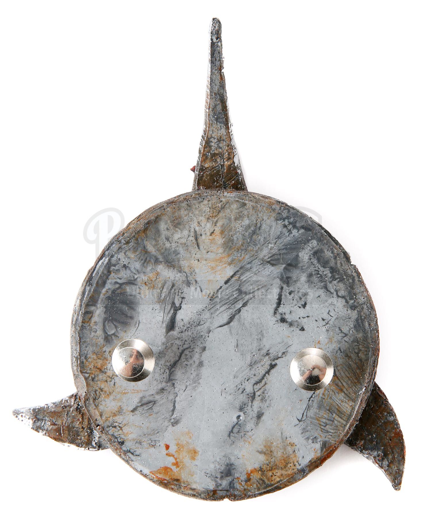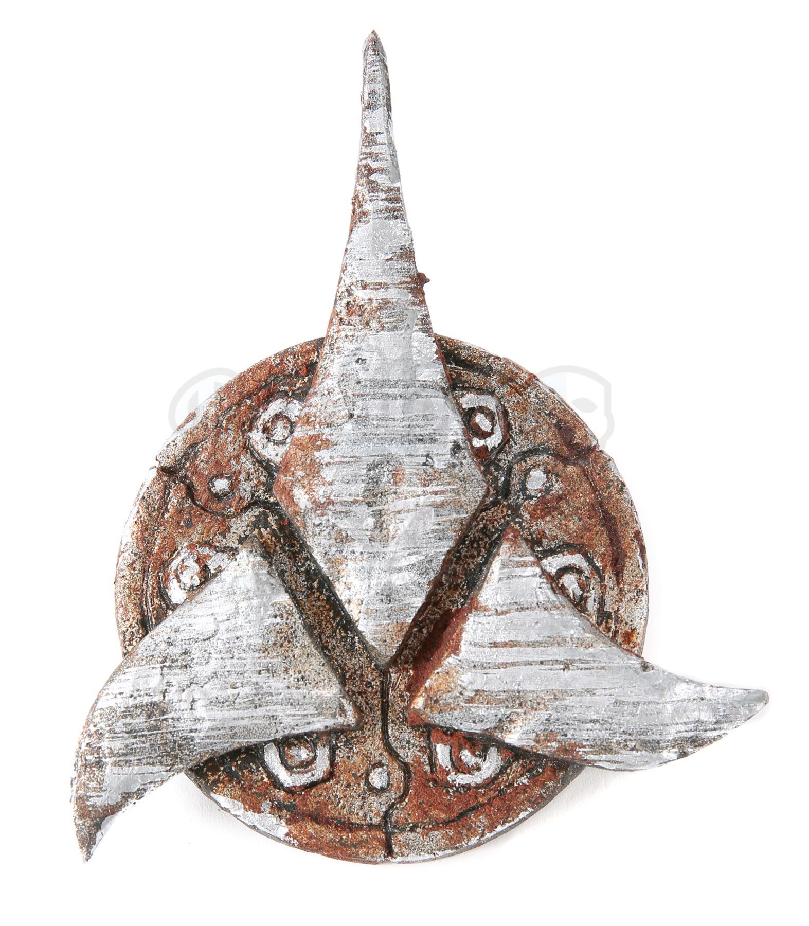 A Klingon Empire insignia from Star Trek Into Darkness. The Klingons wore their three-point insignia on their coats when they intercepted Captain Kirk and his away team on Kronos. Made of urethane, the distressed insignia is painted to resemble muddied metal, with the three points representing strength, duty and sacrifice. The insignia includes two metal pin backs for fastening.Dimensions: 3 ¾" x 4 ½" x 1" (9.5 cm x 11 cm x 2.5 cm)Estimate: $1000 - 1500*Estimated sale price; sold without reserve.