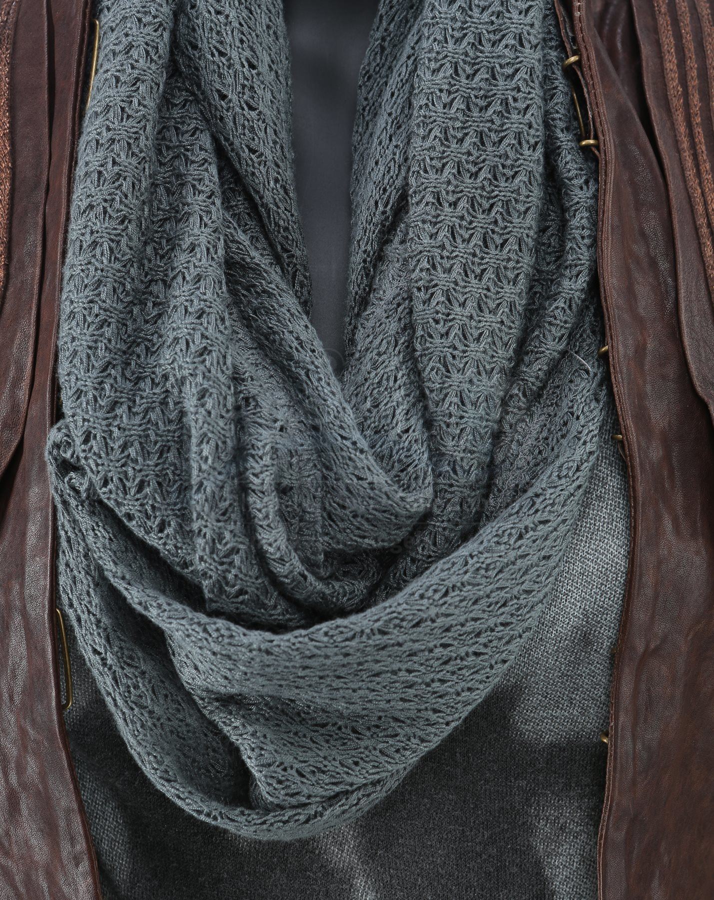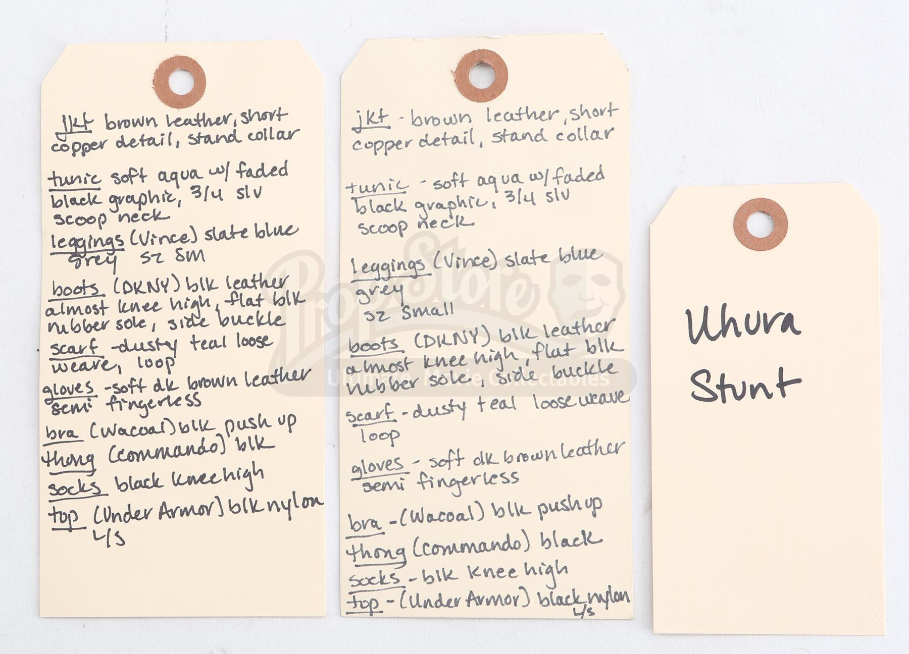 Lieutenant Uhura's stunt Kronos costume from Star Trek Into Darkness. Uhura disguised herself as a K'normian when she traveled to Kronos. The costume consists of a jacket (approximate size double extra small), a dress (medium), leggings (small), a scarf, a pair of gloves, and a pair of boots (marked U.S. size 9).The brown leather jacket features bronze detailing on the collar and shoulders. The grey dress is made of cotton with abstract faded coloring. The blue-grey leggings are made of viscose. There are also a teal knit scarf is made of synthetic material, while the fingerless gloves are made of leather. Also included is a pair of Uhura's black leather boots with rubber soles. The costume features hand-written wardrobe labels with the tunic's collar marked with the name of the stunt actor and the gloves and boots marked as "Stunt". Also included are wardrobe tags with hand-written notes about the costume. Estimate: $1500 - 2500*Estimated sale price; sold without reserve.
