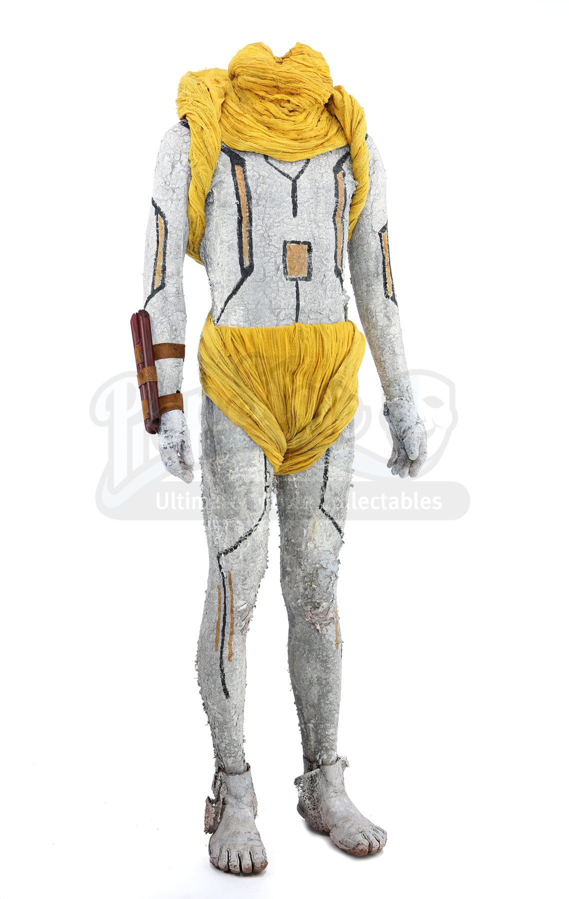 A Nibiran costume from Star Trek Into Darkness. The USS Enterprise saved the primitive Nibiran species from extinction at the beginning of the film. The costume includes a zip-up bodysuit, fabric body wraps, gloves, five-toed running shoes, and a tri-barrel dart gun. The bodysuit is made of Spandex with layers of latex and clay applied to create a flaky, textured finish. The cotton-lined, mustard yellow linen wraps include hidden zippers in order to appear tied to the body. The gloves and five-toed running shoes are also dressed in layers of latex and clay with flaps to conceal the zippers at the ankles. The costume includes wardrobe labels and a production tag that are marked for the stunt performer. Also included is a resin dart gun which includes hook-and-loop lined straps to attach to the actor's hand. The costume shows minor wear due to production use with some flaking to the paint and latex skin; however, the lot remains in otherwise good condition.COPY WRITER NOTE: The Nibiran costumes include long spears which may throw off the shipping estimate. The costume effectively folds down to 18" x 16" x 6" (5.5lbs) with a 2" x 2" x 60" (1lb) spear.Estimate: $600 - 800*Estimated sale price; sold without reserve.