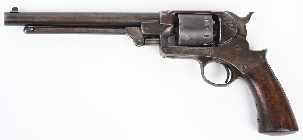 SERIAL 39518. BARREL 8". CALIBER 44 PERCUSSION Matching serial number on frame & cylinder. Six shot single action that is martially marked with inspector stamps on metal and visible but not readable cartouche on one piece walnut grips. Finish is blue. Condition. All legends on frame are sharp. Bore is bright. Grips are very good to excellent with wear at butt but nice and intact. You can still see flashes of blue but gun is basically a soft homogenous patina. Crisp action. Very nice example of popular Civil War used sidearm. ANTIQUE