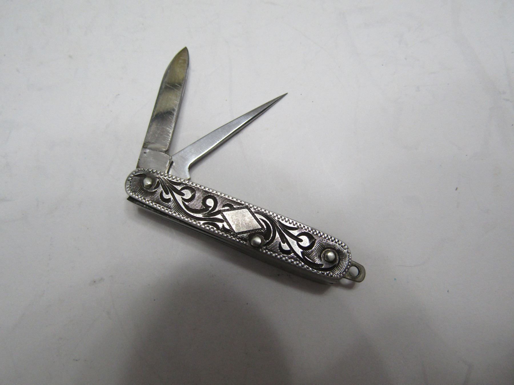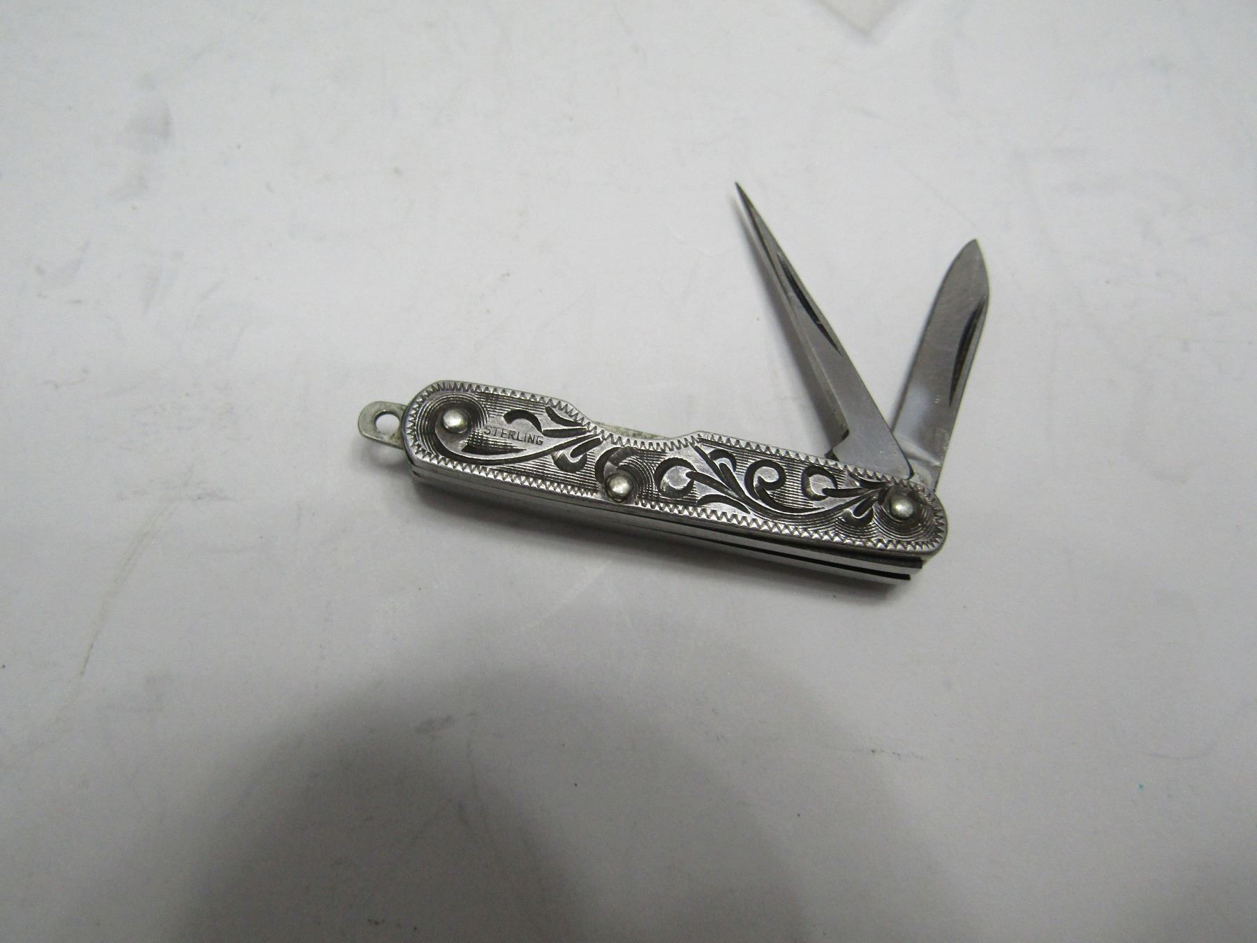 STERLING SILVER MINI PIPE SMOKERS KNIFE FOR POCKET WATCH CHAIN. 2 3/4 INCH LONG WITH 1 1/8 INCH BLADES. USA SHIPPING $5
