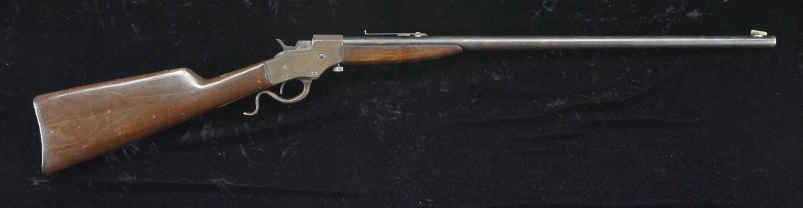 Cal. 22 LR. S# R732. Bbl. 24". Mfg. 1915-1940. The model 1915 Favorite a redesigned version of the early original Stevens Favorite, mfg. slightly heavier & stronger than the original. Steel receiver w/ blued rnd. bbl. Brass blade front w/ elevation adj. rear sights. Hardwood stock & forearm. Top of receiver reads "TRADEMARK / FAVORITE" & stamped on top tang "MODEL 1915". S# located on bottom tang. CONDITION: blued finish on bbl. covers the majority w/ spots of thinning & gentle patina. Receiver finish is thinned to a light brown w/ scattered light patina. Front stock is stained primarily on bottom w/ several sm. impressions & a 1.25" crack at top against receiver. Shoulder stock appears to have been painted brown w/ several areas thinned to show original finish. Several scattered sm. impressions. Checkered buttplate illustrates wear & 1.25" crack from bottom screw to edge. Takedown screw locks tightly. Frosted bore w/ visible rifling. PROVENANCE: Estate Collection of Jack Verret Sr. (22-854/JZ). CURIO. $50-75.