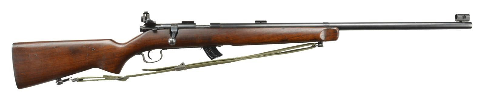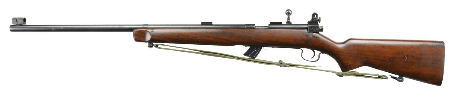 RIFLE. Cal. 22 LR. S# 204822. Bbl. 26" target weight. Stevens globe front sight & target receiver sight. Bbl. & receiver have blocks for scope attachment. Left side of receiver has flaming bomb ordnance marks & "U.S. PROPERTY" mark. Walnut target stock w/ grooved steel buttplate, accessory rail in forearm & green web sling on original swivels. Rear swivel has white painted rack no. "42". MAGS: 2 - 10 rd. Brownell's replacements. CONDITION: over 90% lightly faded blue showing scratches on left side of bbl. Wood has age darkened lightly worn appearance w/ numerous scratches, handling marks, dents & gouges. Bright bore w/ strong rifling. PROVENANCE: from the estate collections of Charles P. Obremski. (22-1300/DS). CURIO. $300-500.