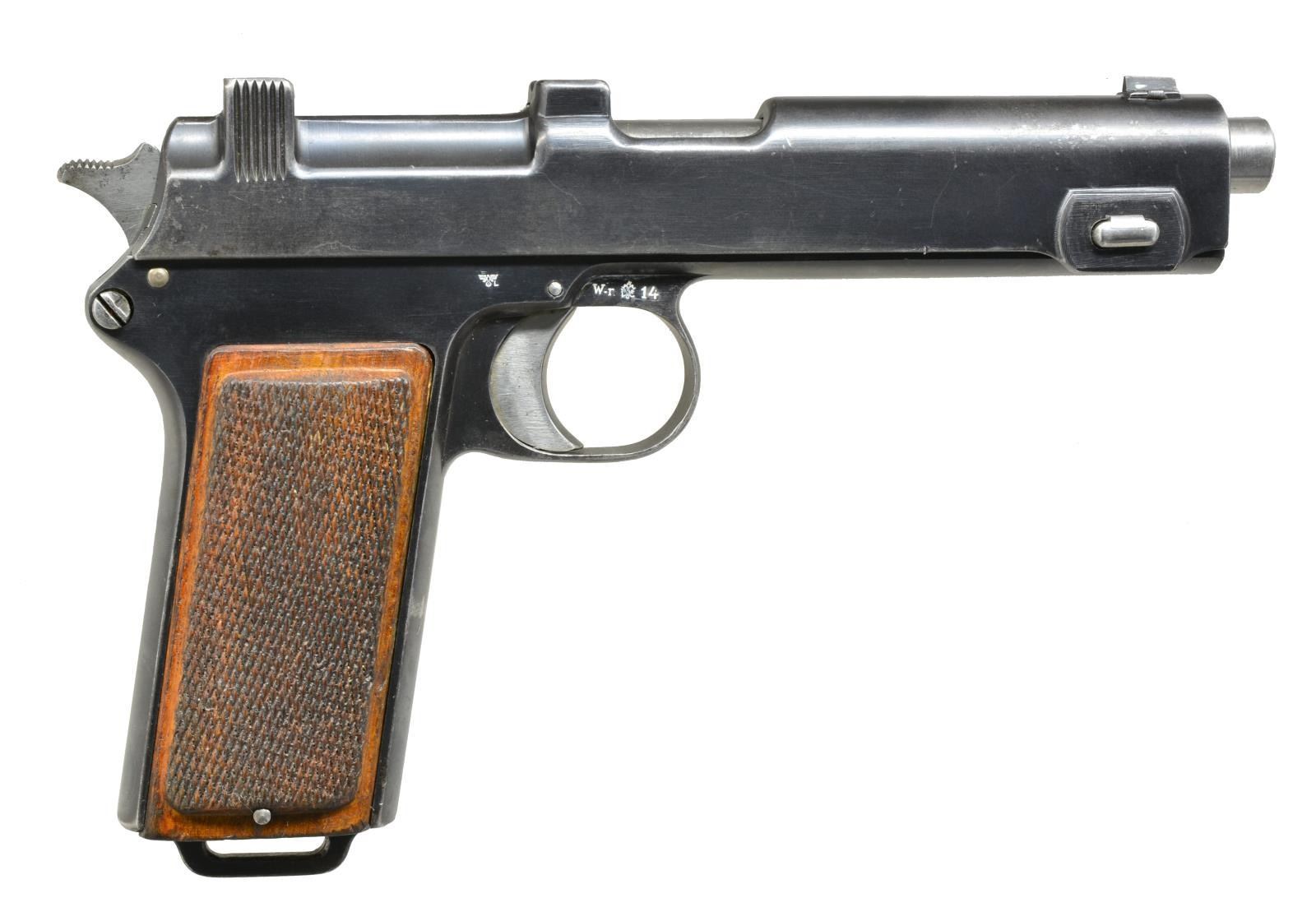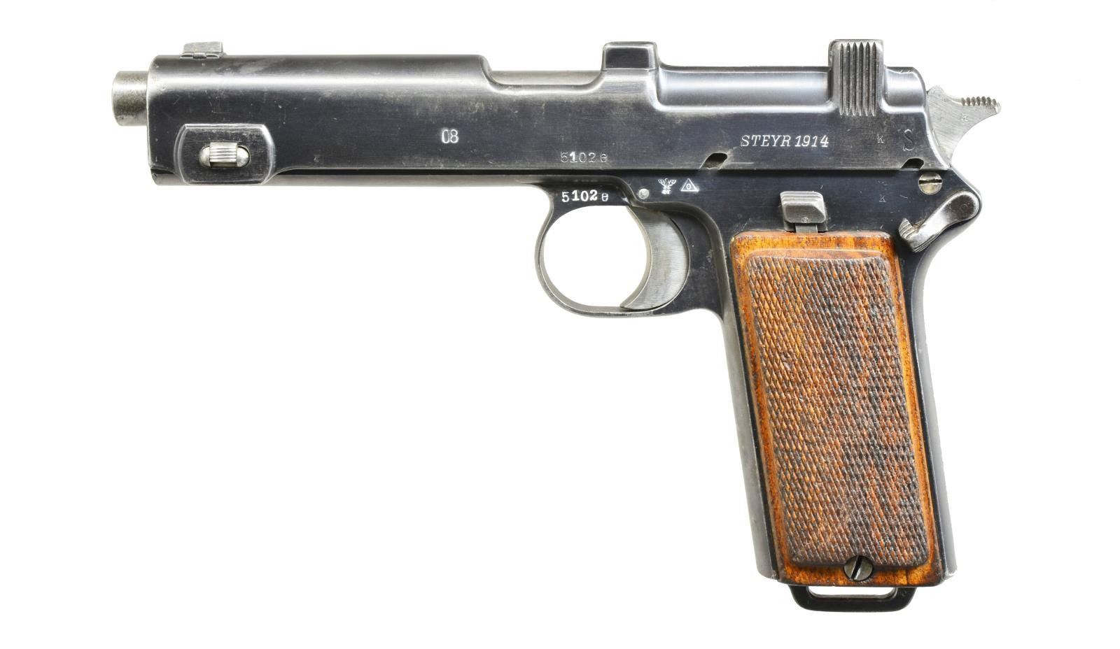 PISTOL. Cal. 9mm Luger. S# 5102e. Bbl. 5 1/4". Mfg. 1911-1919; approx. 300,000 units. Slide marked "STEYR 1914" as adopted by Astro-Hungary having "W-r", Astro-Hungarian proof (also on lanyard loop) & "14". Left side of slide w/ "08" indicating 1938 confiscation & conversion to 9mm Luger. Right side of frame behind trigger pivot has eagle party symbol w/ "L" indicating police use. Matching numbered frame, slide & bbl.; wedge w/ arrow but not numbered. Checkered walnut grips. Mfg. w/out detachable mag.; internal mag. fed w/ striper clips by built in guide on slide. CONDITION: good to very good overall appearance w/ light use & high point wear. Occasional light mark & cleaned peppery oxidation. Light staining on bbl. Sides of hammer have cleaned in the white appearance. Near excellent appearing strawed extractor. Very good grips w/ light hand wear. Near excellent bore. (20-3346/NW). CURIO. $1,200-1,800.
