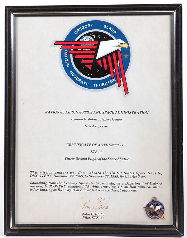 Sts-33 Flown Mission Pendant. Framed 8� x 11" STS-33 certificate and framed mission pendant. The certificate reads in part "Certificate of Authenticity, STS-33 This mission pendant was flown aboard the U.S. Space Shuttle Discovery, November 22, 1989". Signed by John E. Blaha, Pilot, STS-33.