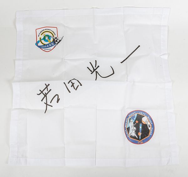 Sts-72 Kiochi Wakata Autograph on a Flown Silk Scarf. The scarf measures 16x17" with multicolored mission and crew patches in two corners. Interesting and attractive. Ex. the Michael Orenstein Estate Collection.