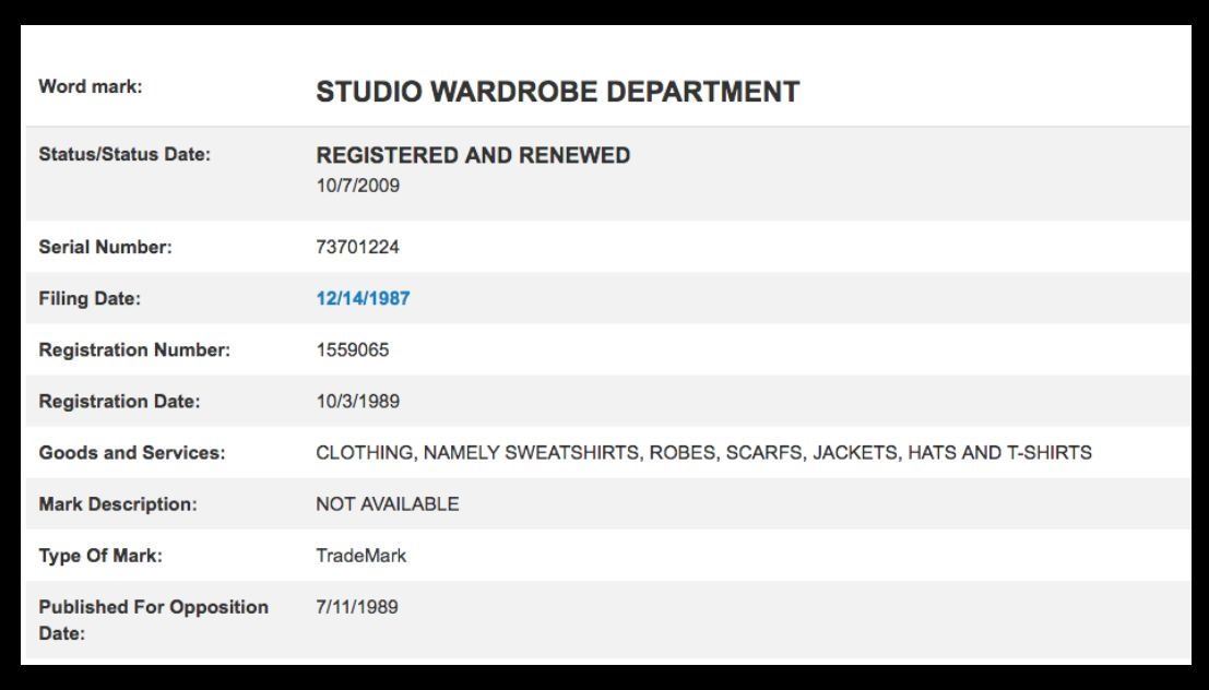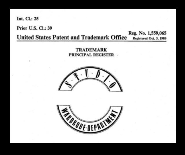 GREAT AND RARE OPPORTUNITY TO OWN A FAMOUS LOS ANGELES HOLLYWOOD STUDIO CELEBRITY CLOTHING BRAND TRADEMARK "STUDIO WARDROBE DEPARTMENT" AND RELATED DOMAIN NAMES