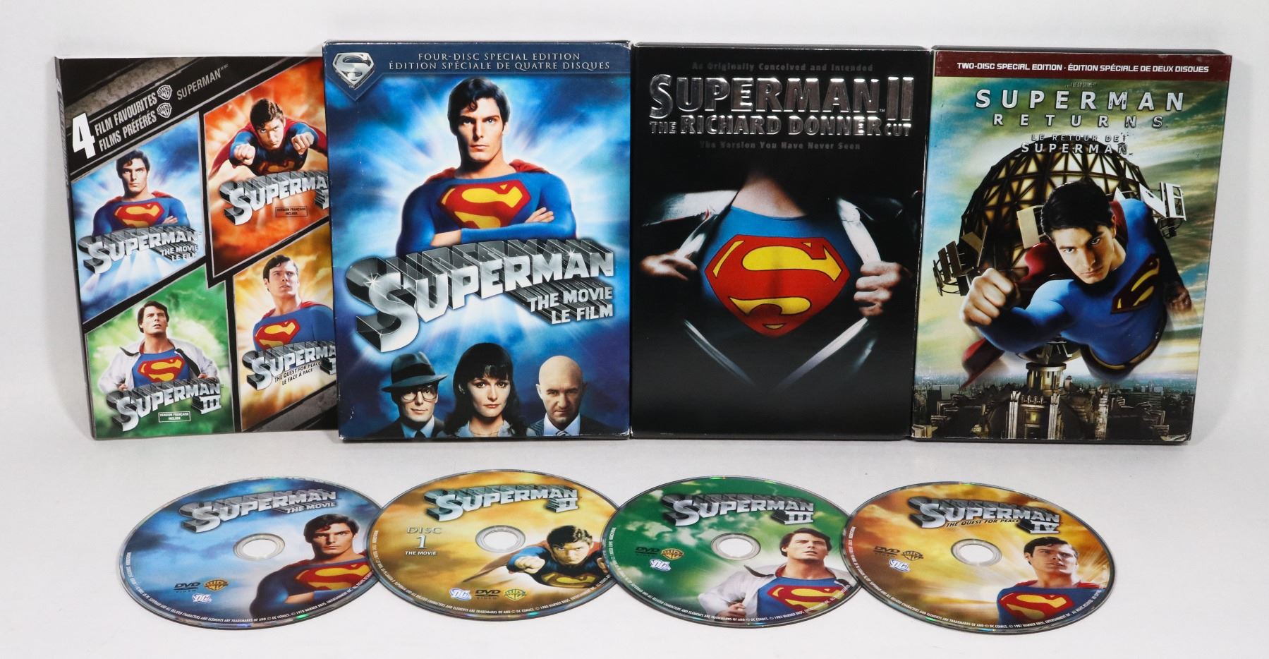 SUPERMAN THE MOVIE SPECIAL EDITION, SUPERMAN II RICHARD DONNER CUT, SUPERMAN RETURNS SUPERMAN, SUPERMAN II, SUPERMAN III, SUPERMAN IV,PREOWNED GREAT CONDITION***ITEM(S) LOCATED IN LETHBRIDGE ALBERTA. ALL ITEMS IN THIS AUCTION ARE ELIGIBLE FOR OUR FREE TRANSPORT TO EDMONTON OFFICE SERVICE. WORLDWIDE CANADA POST SHIPPING IS AVAILABLE