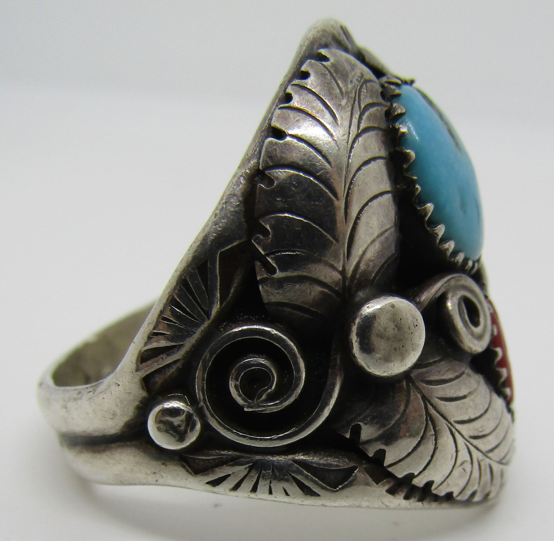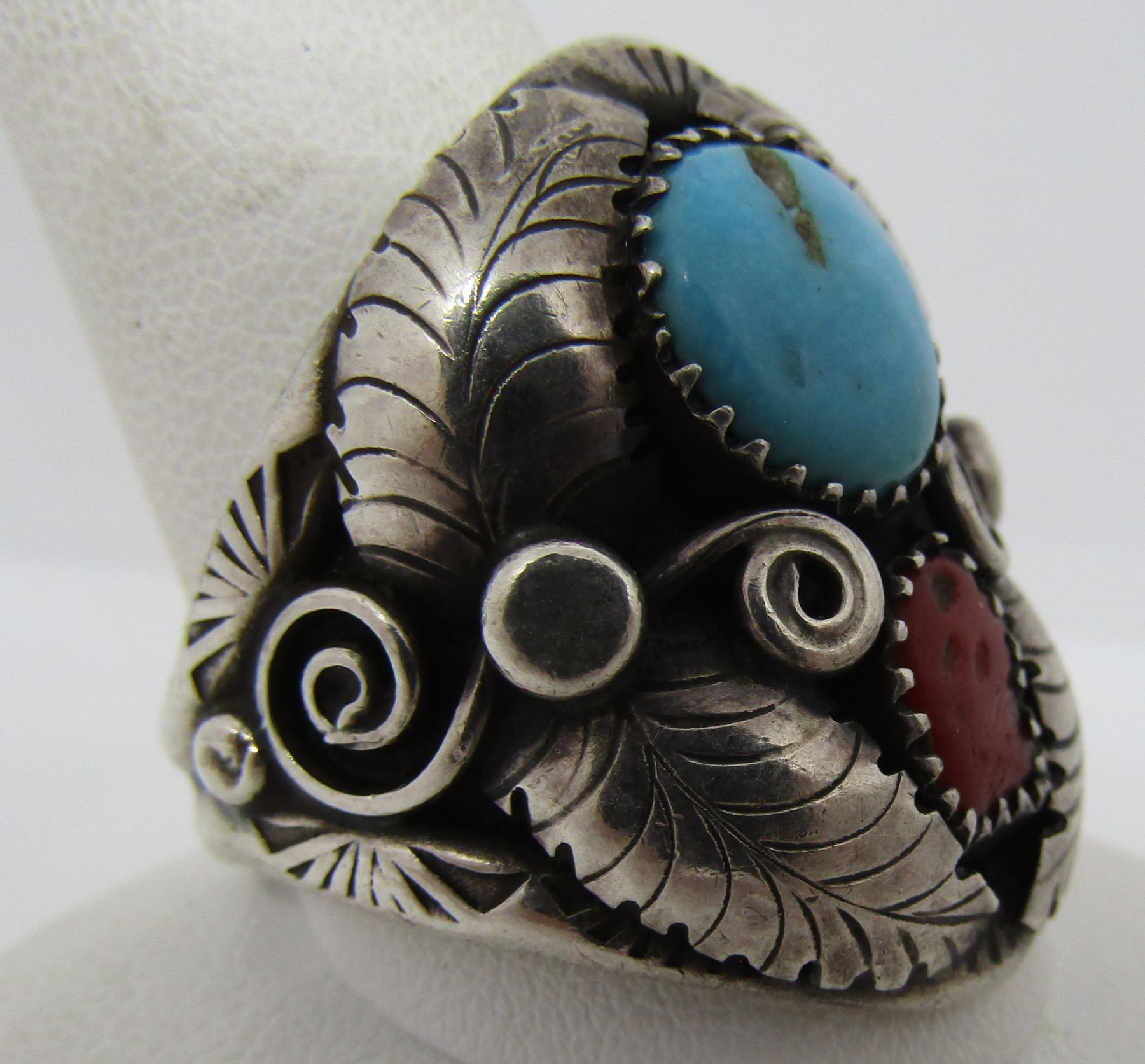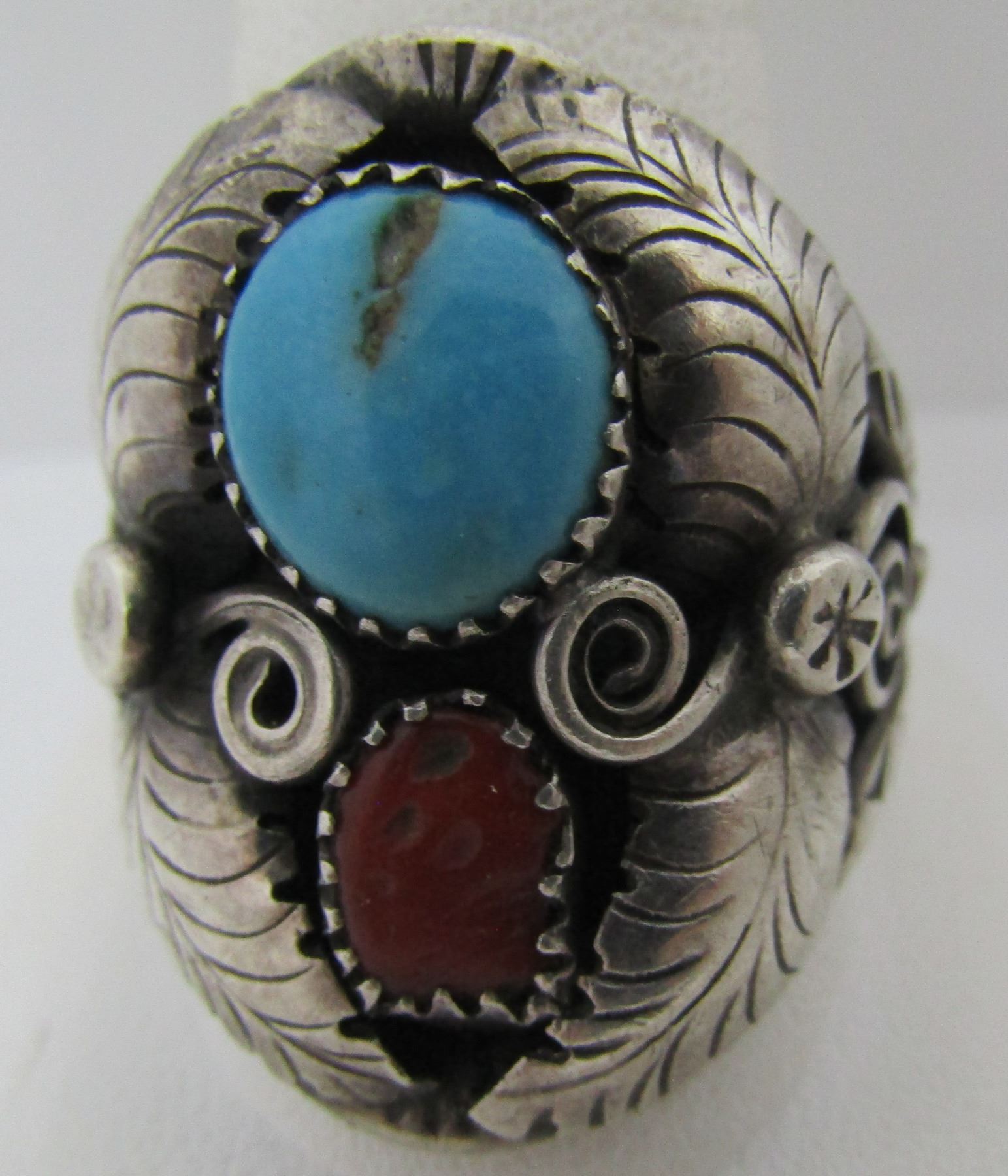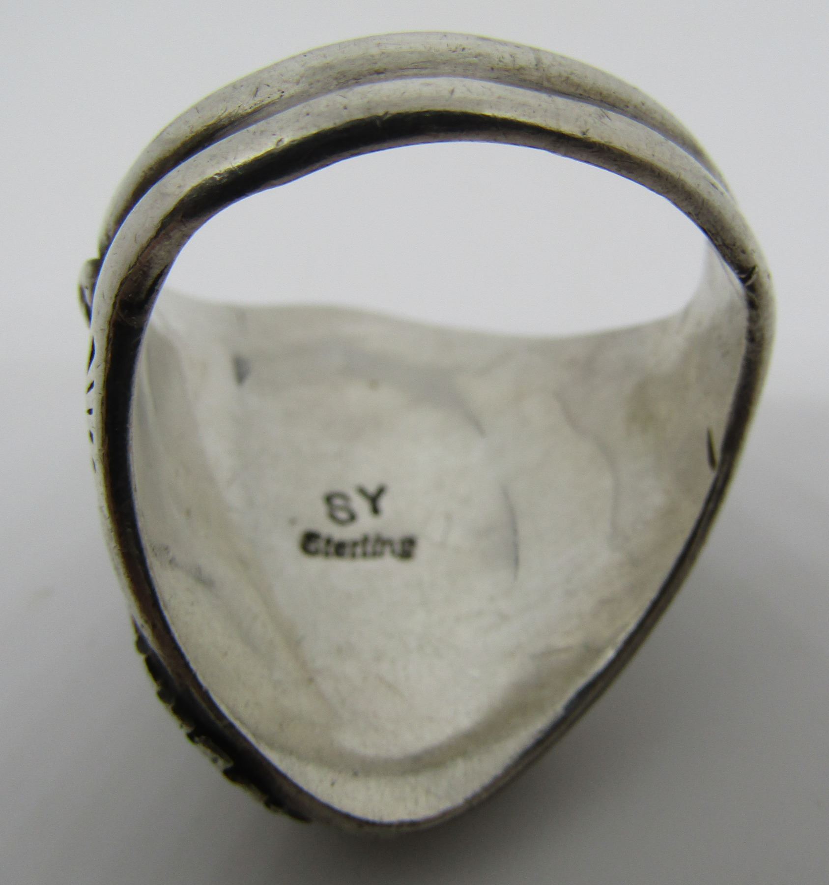 HALLMARKED "SY STERLING" SILVER VINTAGE ESTATE NATIVE AMERICAN SOUTHWEST NAVAJO INDIAN JEWELRY. TOP MEASURES 30 MM WIDE. WEIGHS 13.0 GRAMS. SIZE 13. USA SHIPPING $5.