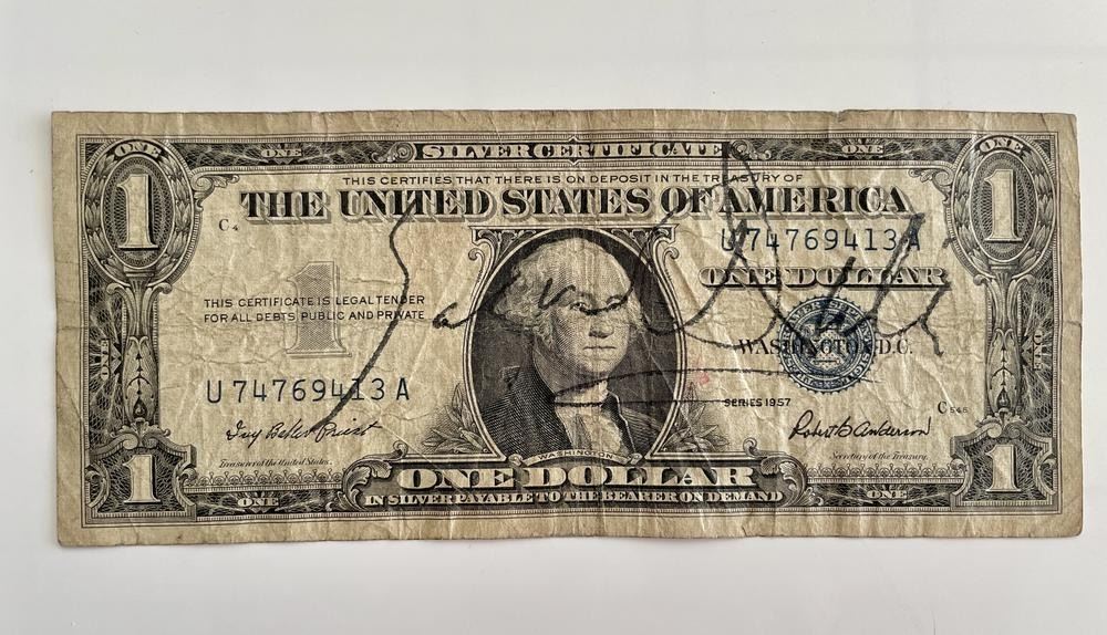 Salvador Dali signed dollar bill. Bill is in fair shape due to age. 1957 $1 bill