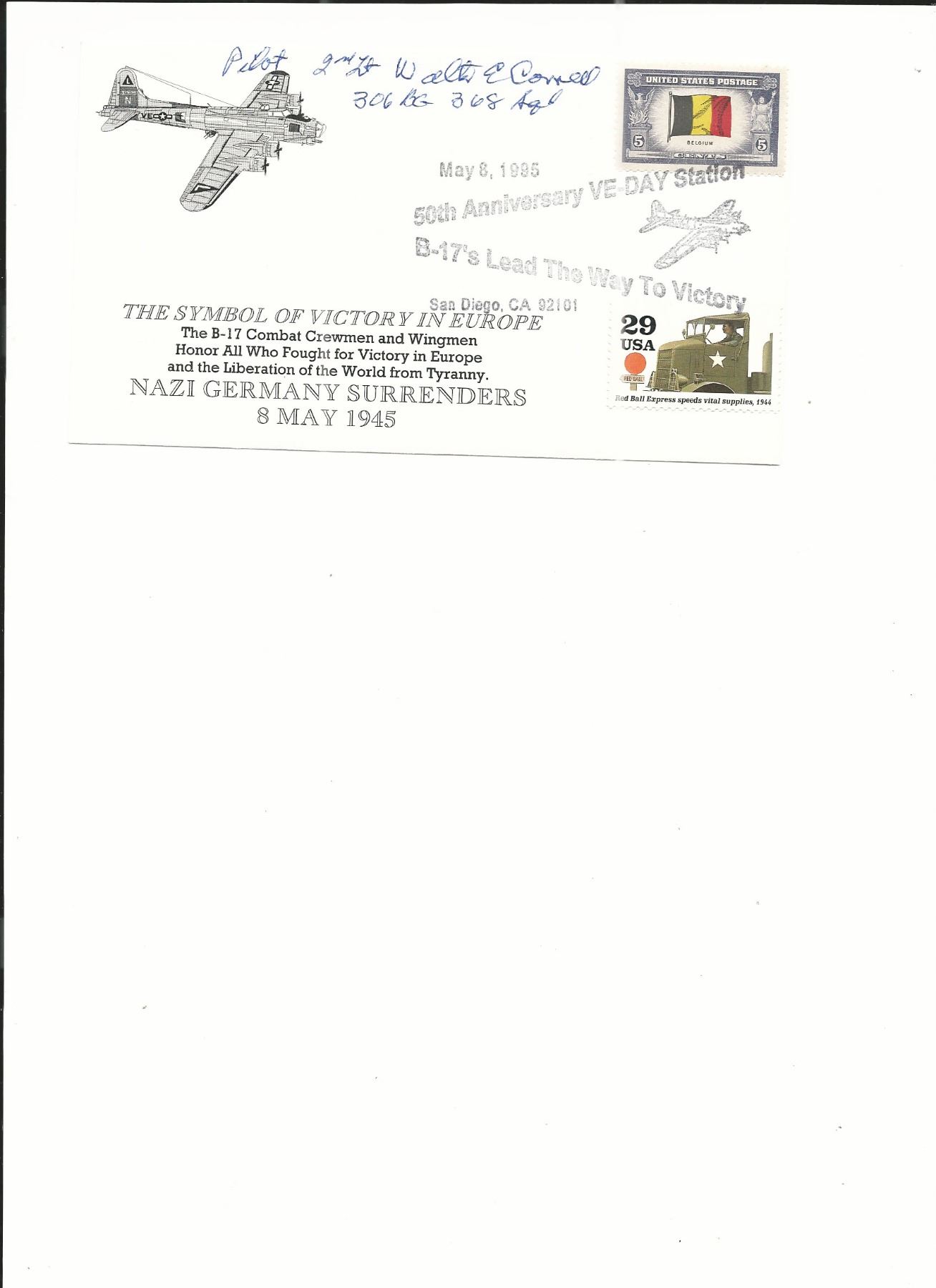 San Diego, CA - VE Day 50th Anniversary - B-17's Lead the Way to Victory - Signed First Day Cover Autographed by Pilot 2nd Lt. Walter E. Cornell - May 8th 1995
