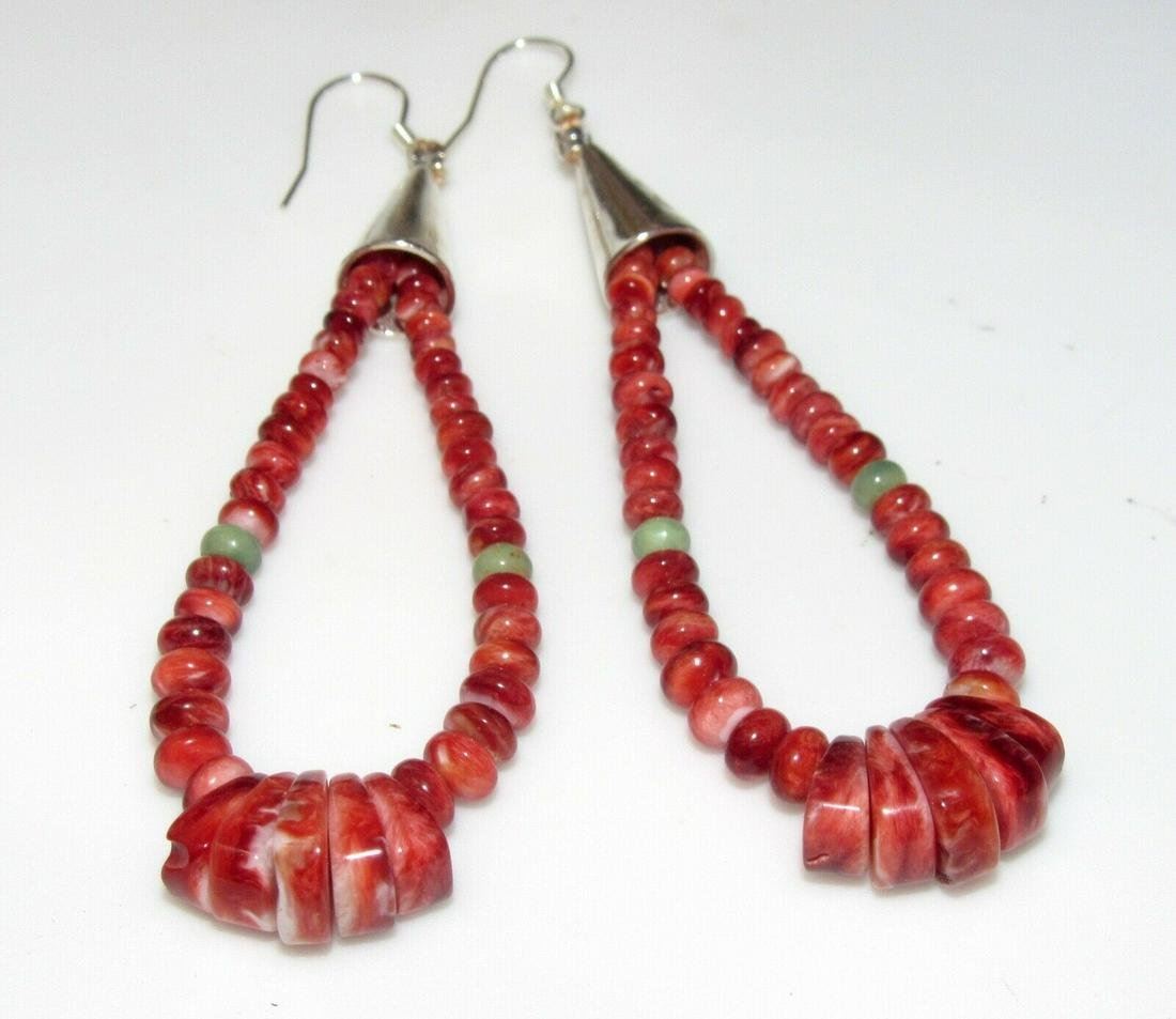 Fab statement red spiny oyster, turquoise and sterling silver earrings by a Santo Domingo artist. Measure impressive 3.5" long including the hooks. Gorgeous, colorful earrings!