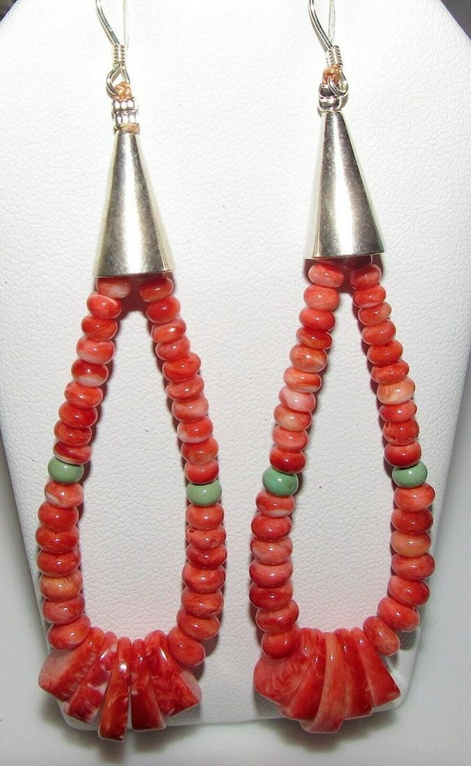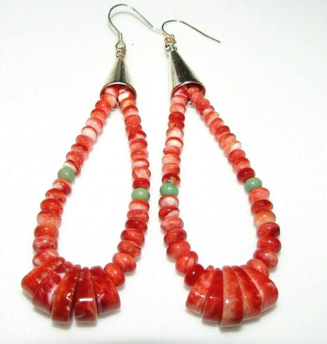 Fab statement red spiny oyster, turquoise and sterling silver earrings by a Santo Domingo artist. Measure impressive 3.5" long including the hooks. Gorgeous, colorful earrings!