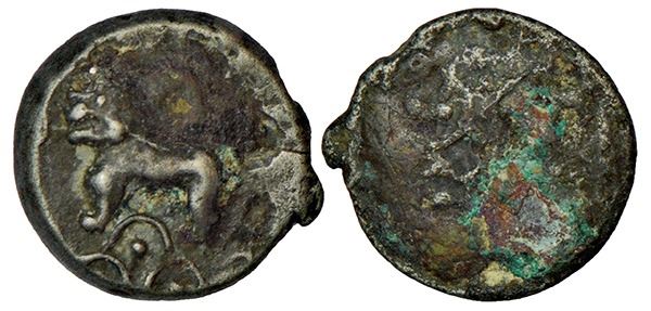 Satavahanas, alloyed copper coin of Siri Satakani (c.100-50 BC) of 'lioness' type, Junnar area, not listed in PAIC, 3.05g. Obv: lioness perched on a hill, with tail raised, traces of Brahmi legend in exergue. Rev: traces of 'Ujjain'-symbol within a rectangular border.