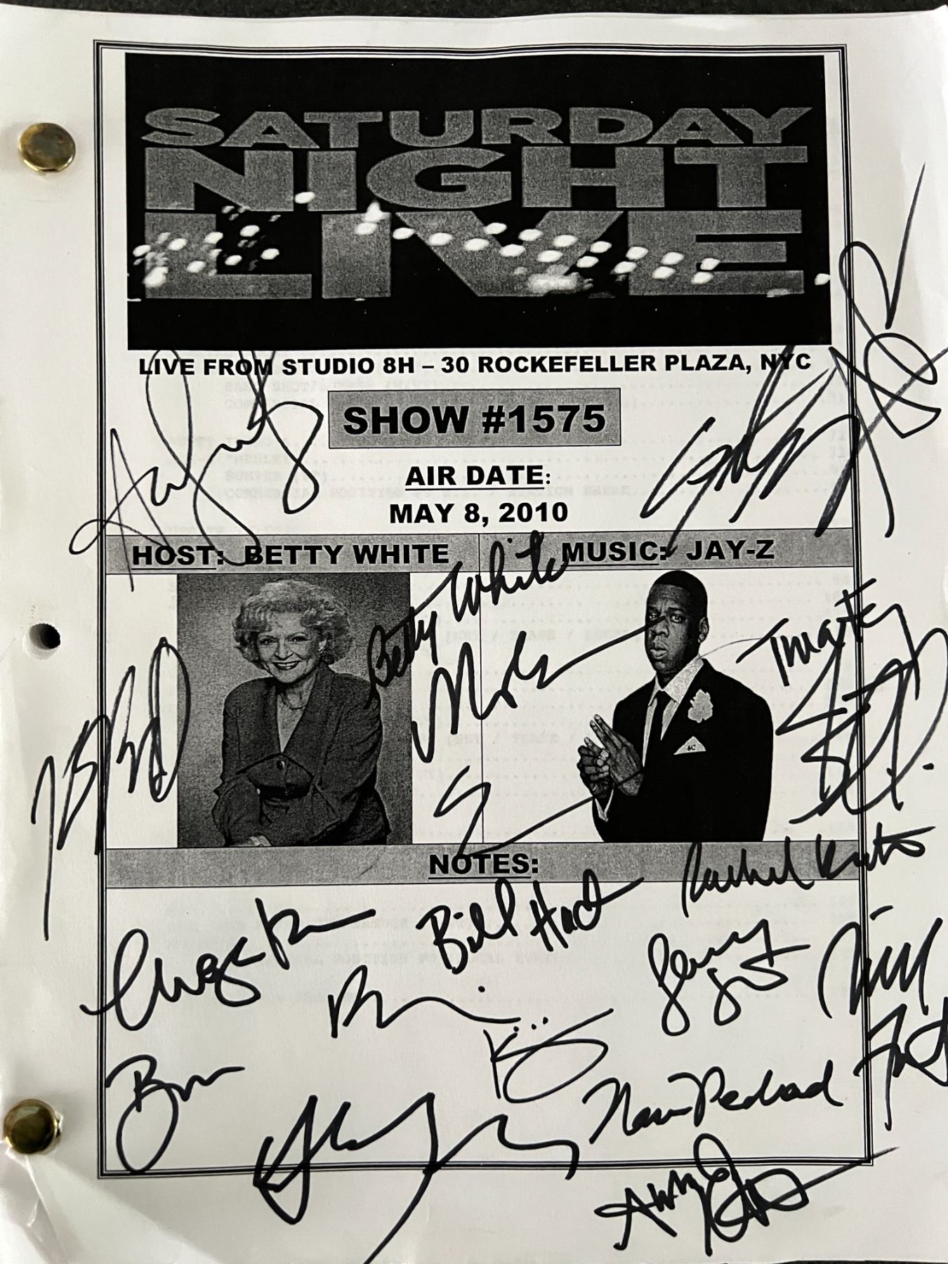 Saturday Night Live cast signed script autographed by Betty White,Jay Z, Bill Hader, Kristen Wiig, Tina Fey, Fred Armisen, Will Forte, Seth Meyers, Andy Samberg Andy Samberg, Jason Sudeikis, Abby Elliott, Bobby Moynihan, Nasim Pedrad, Rachel Dratch, Amy Poehler, Ana Gasteyer, Jenny Slate, and a few others