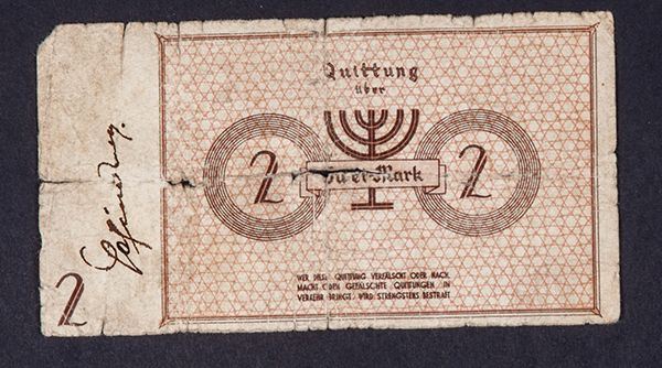 Jewish ghetto money signed by Oskar Schindler on the verso, 4� x 2� in., n.p., n.d. The note is worn but the signature is bold, the ink having faded to brown. This is a two mark (zwei mark) note used in the Litzmannstadt Ghetto in Lodz, Poland. Since the inhabitants of the ghetto were not permitted to use German money, they were forced to use separate ghetto money, which they produced and which had no value outside the ghetto. This note is dated in print: Litzmannstadt den 14 Mai 1940 and is signed in print by M. Rumkowski as Der Aelteste der Juden in Litzmannstadt. "Quittung" at top right means "receipt"; a Star of David is at upper left and the background is made of connected Stars of David to resemble a barbed wire fence. A menorah is on the verso. Out of the approximately 300,000 people who lived in the ghetto during its existence, only 877 were living when it was liberated by the Russians in January 1945.