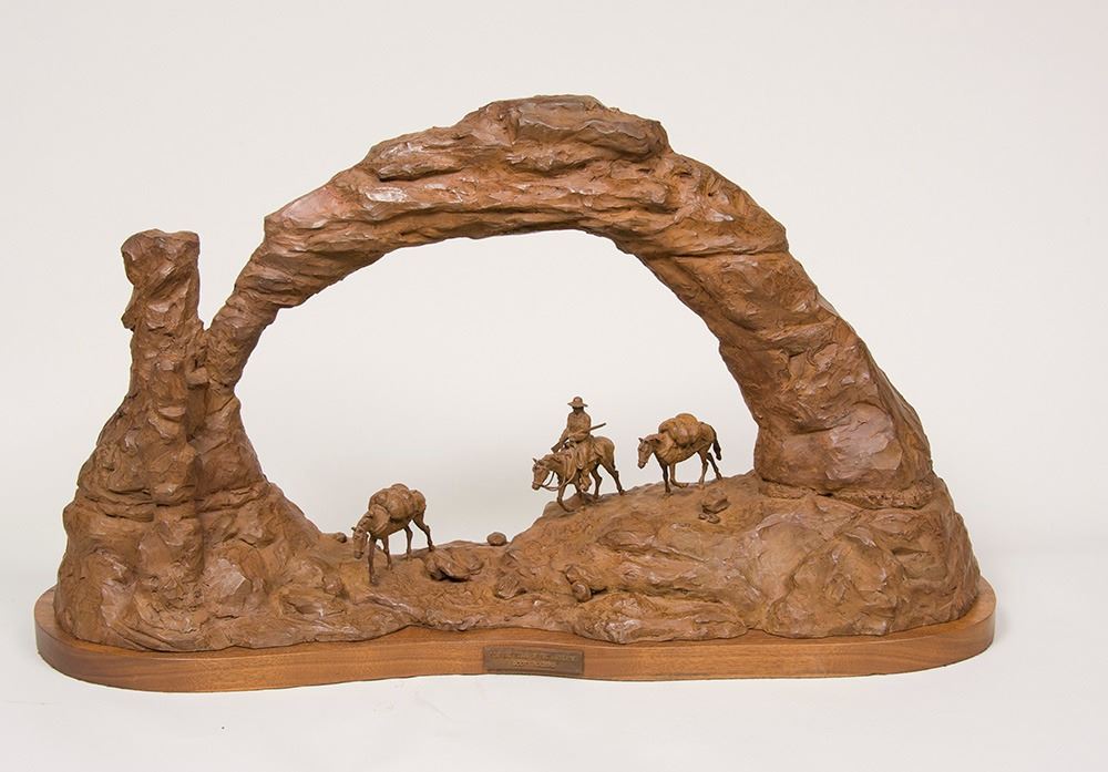 Artist: Scott Rogers; Title: On The Trail of the Ancients; Medium: Bronze, cast 18/30; Dimensions: 26 inches overall height; Signed: Signed and dated '00; Framed/Base: 26 x 48 x 14 inches - 70 lbs.
