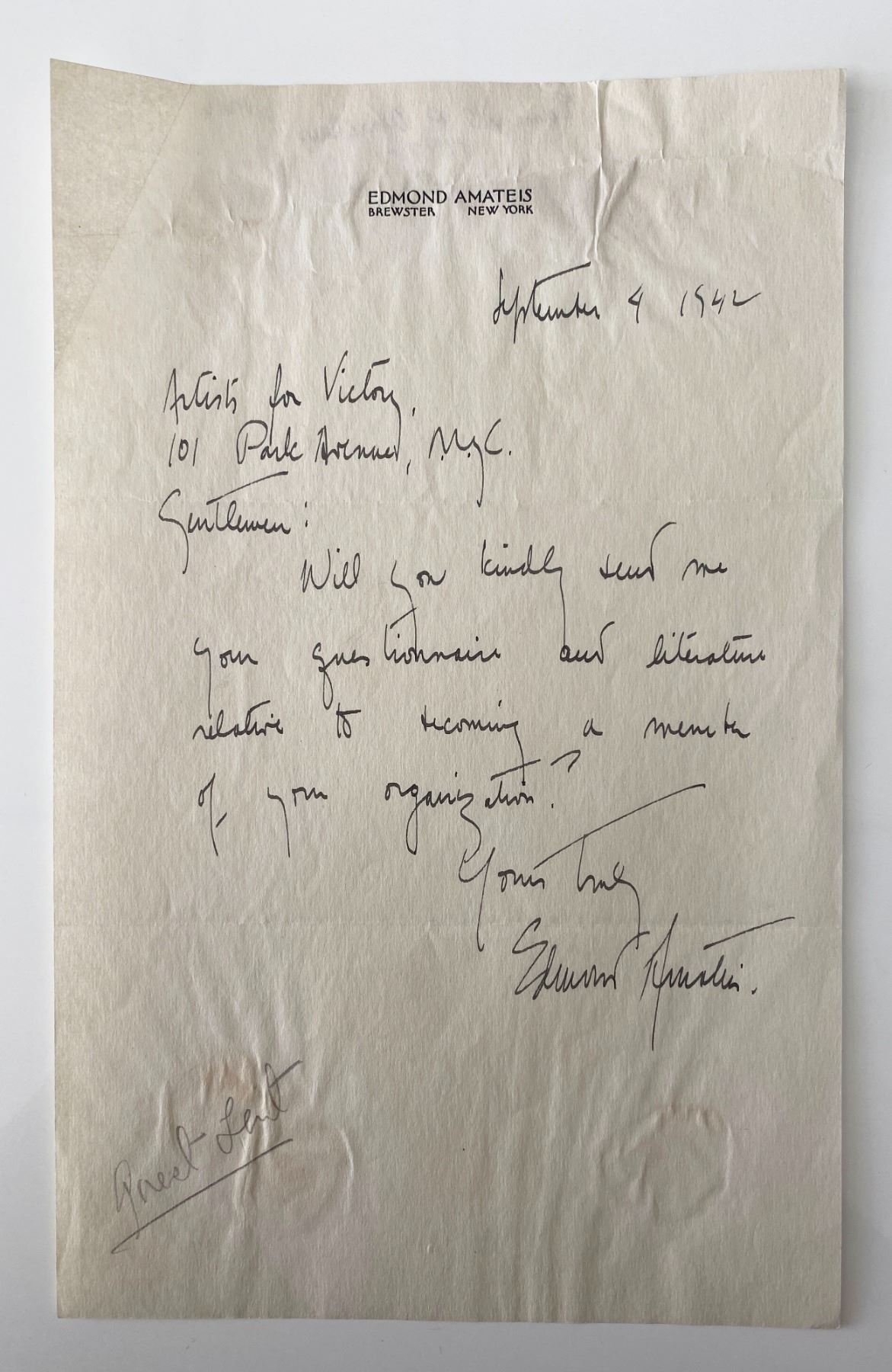 Sculptor Edmond Amateis signed letter.6x10 inches