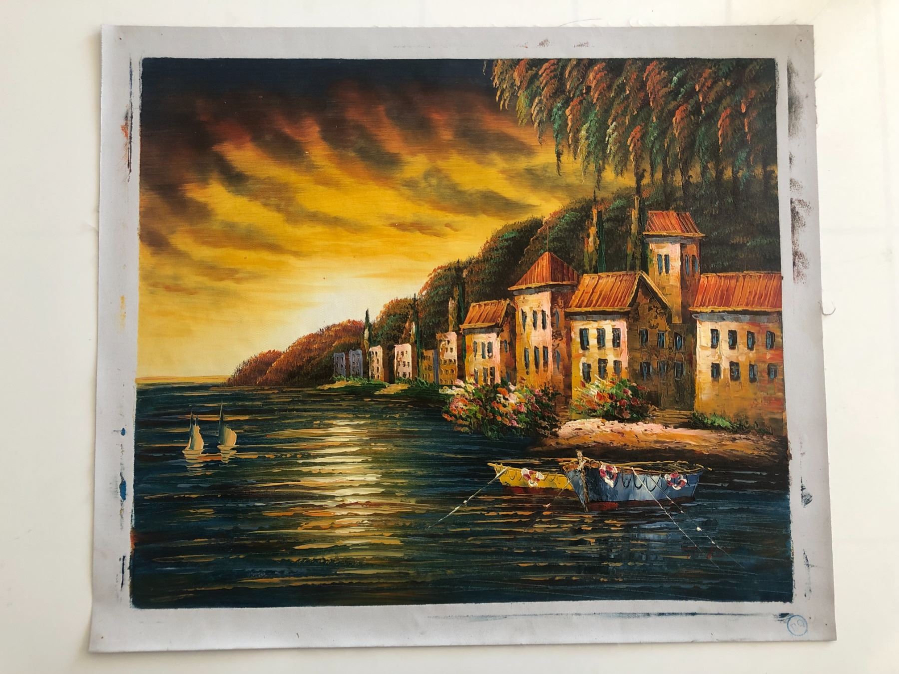 Seaside Town original painting on canvas. Signed by artist. 23x27 inches