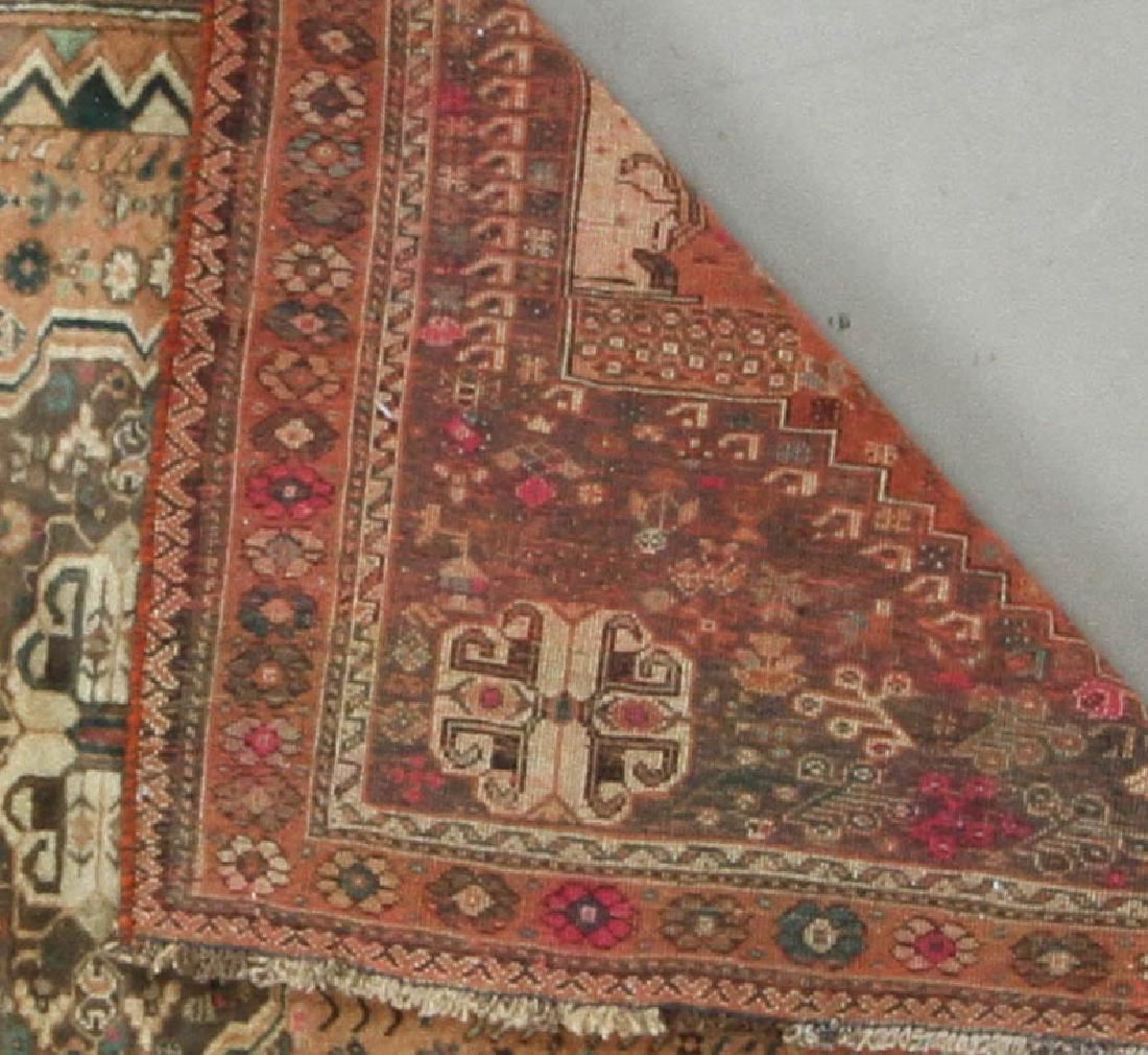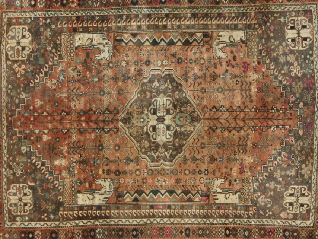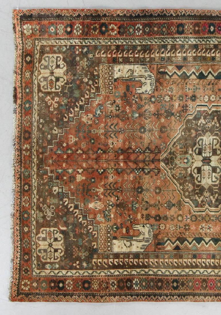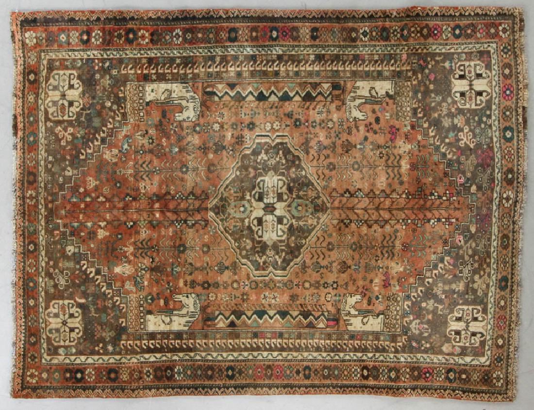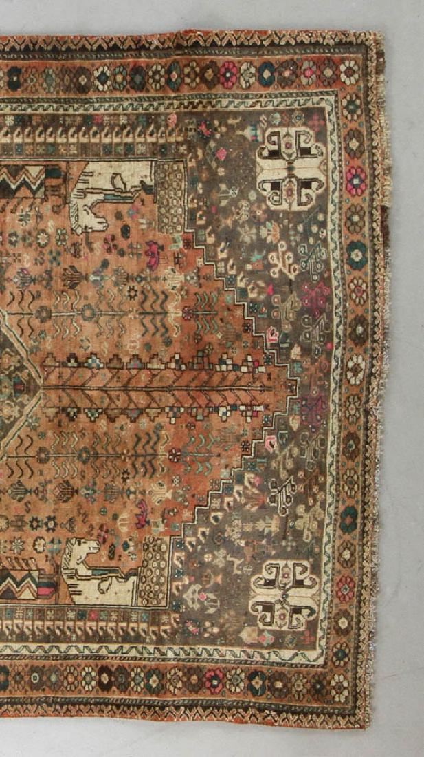 Semi-antique oriental rug with horse design, 6' 9" x 5' 2". Some wear and fading. Provenance: Cambridge, Massachusetts estate.