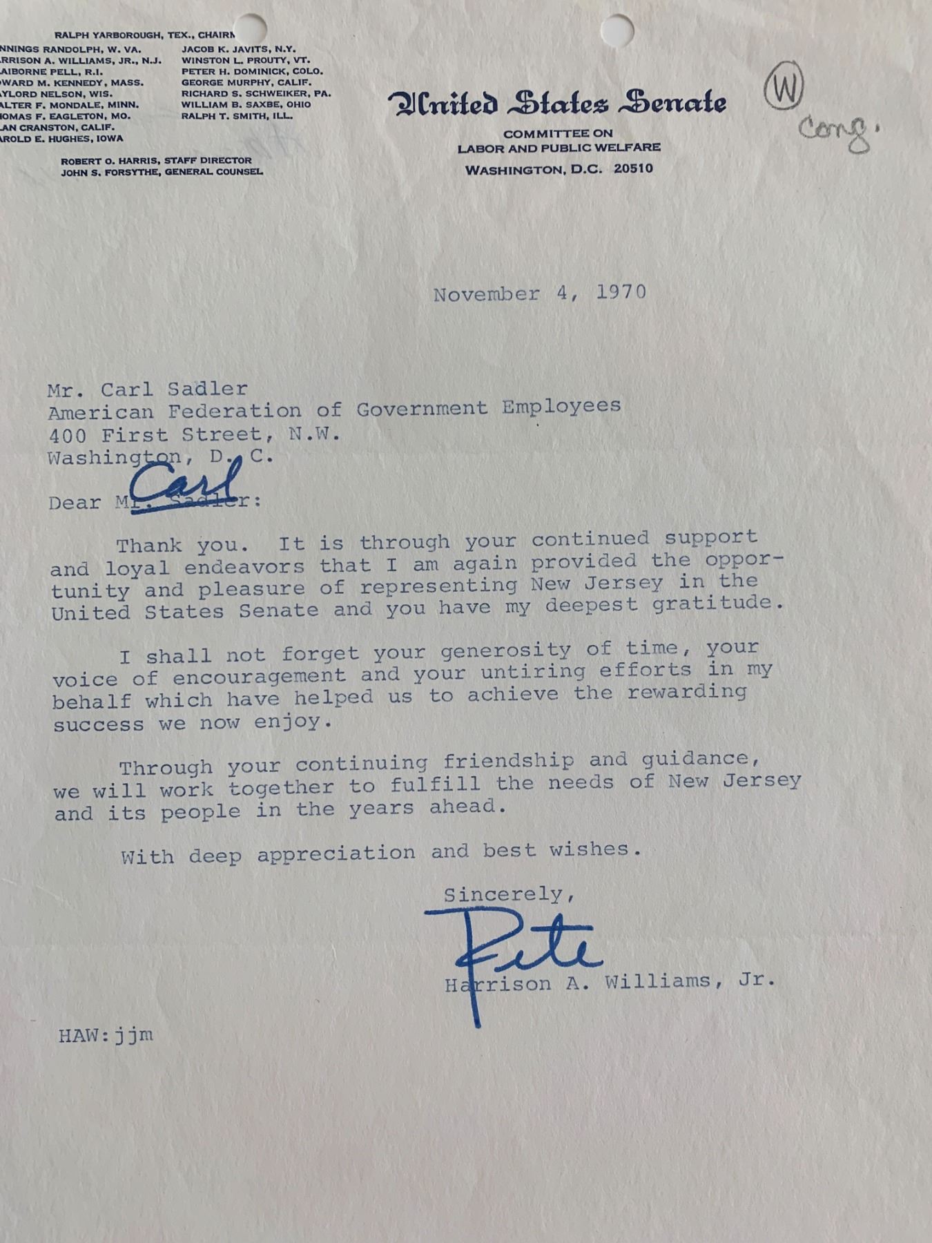 Senator Harrison A. Williams Jr. Signed Letter. 8x11 inches