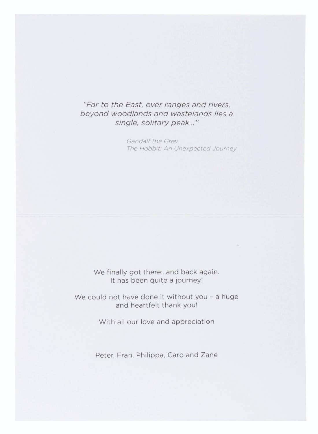(Warner Bros., 2012) A collection of set decor props from production of "An Unexpected Journey.” Included are a wooden bottle storage case from Bilbo’s home, an unfinished wooden ladle from Beorn’s home, and a ceramic pot. Also included is a printed crew thank you card from director Peter Jackson and the Producers. Ranging in size from the 6” x 4” card to the 25.75” x 4” x 1.5” thick ladle, the items are all in good to fine condition with light wear, scuffs, scratches, and chips from production use.