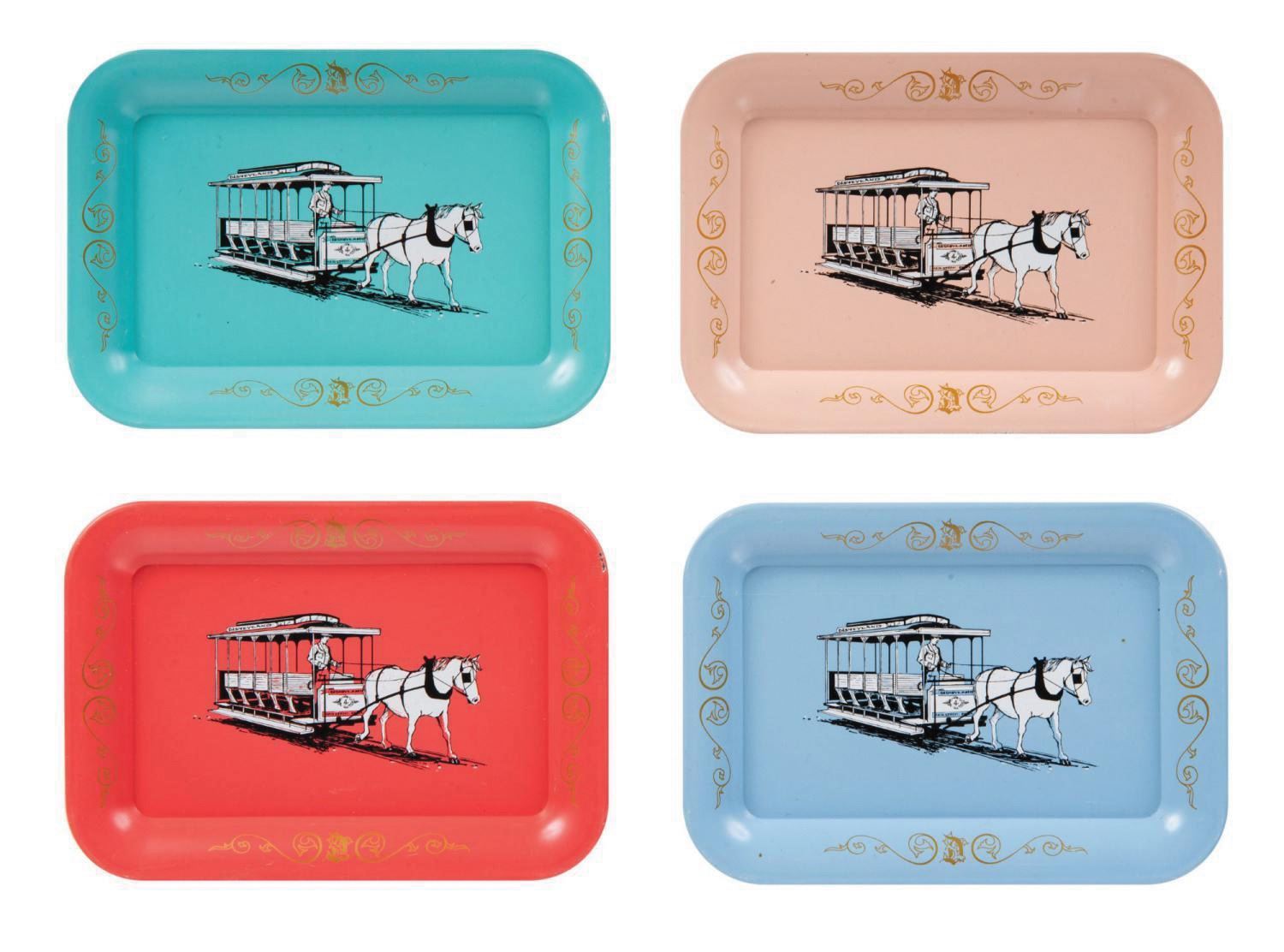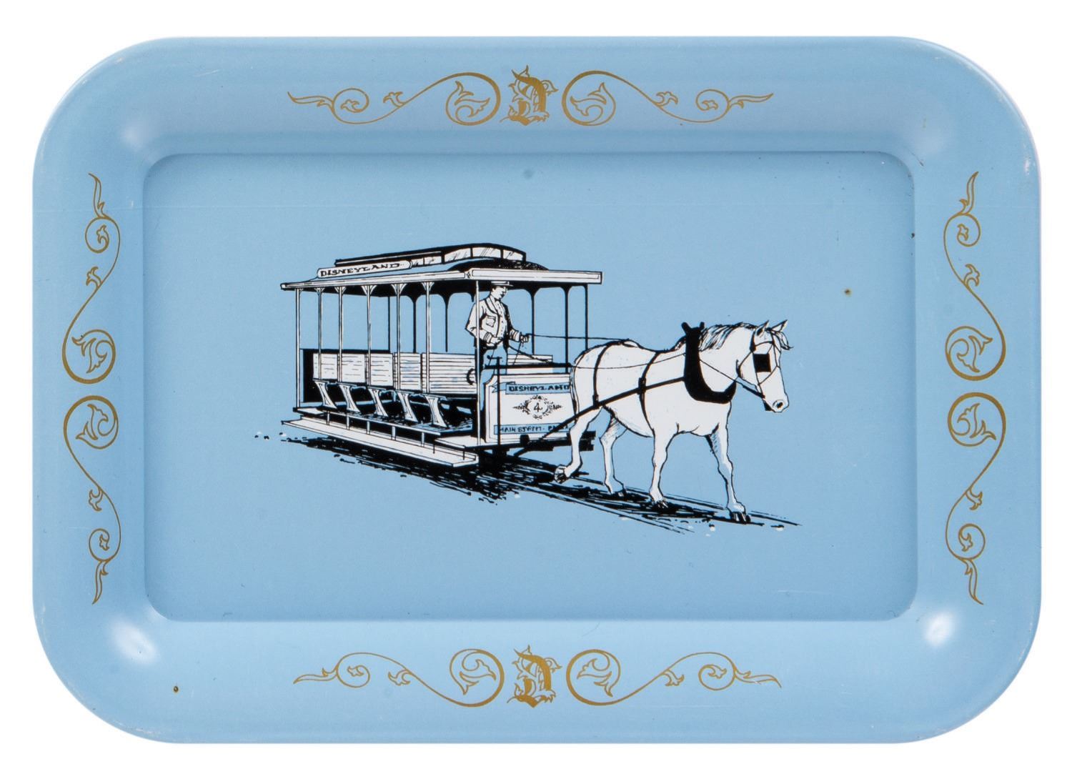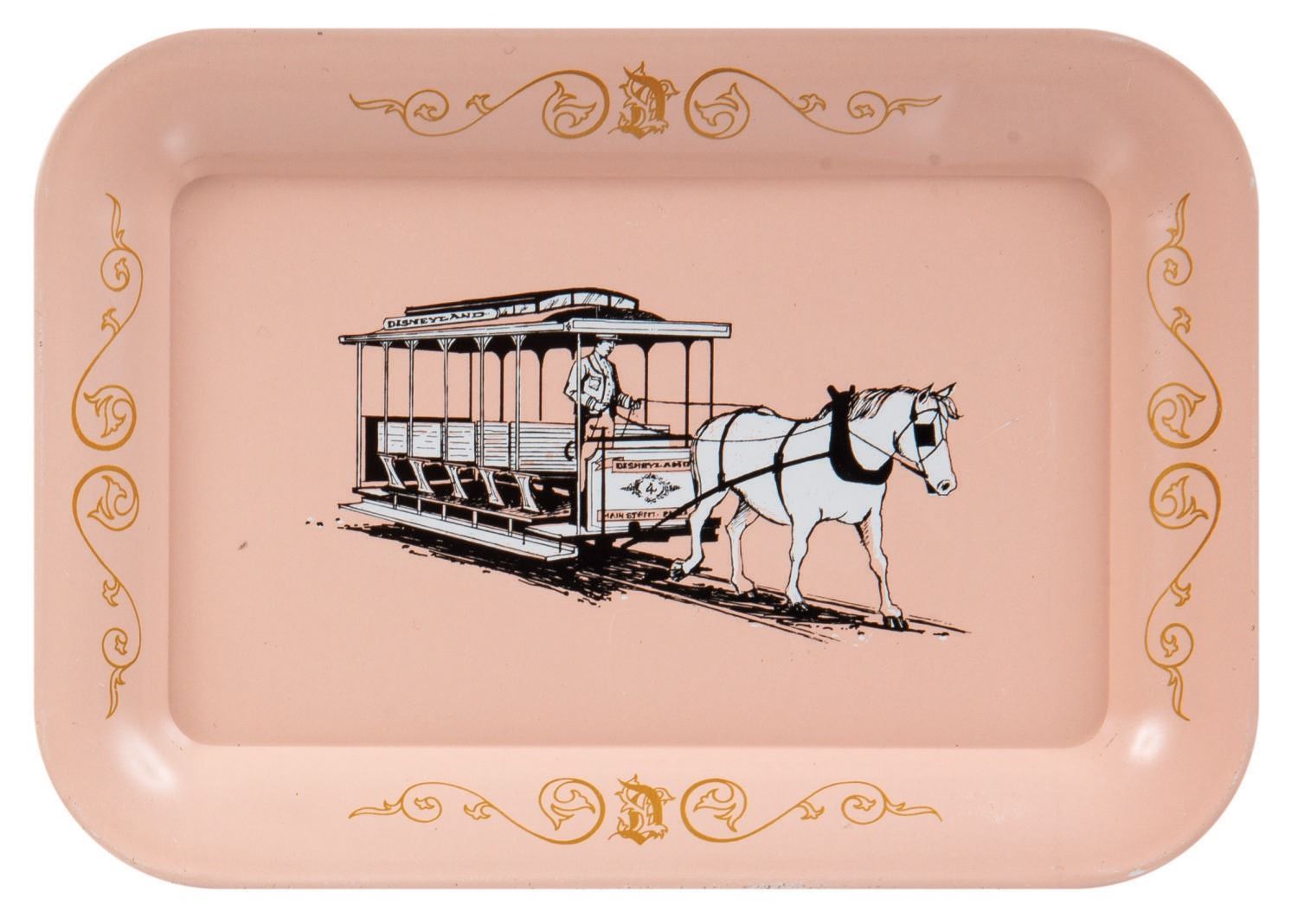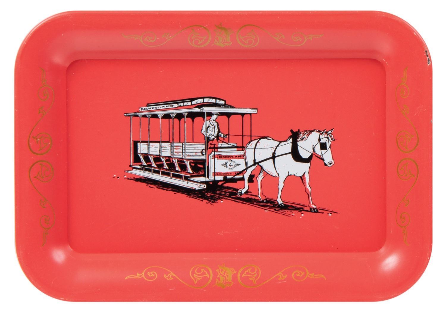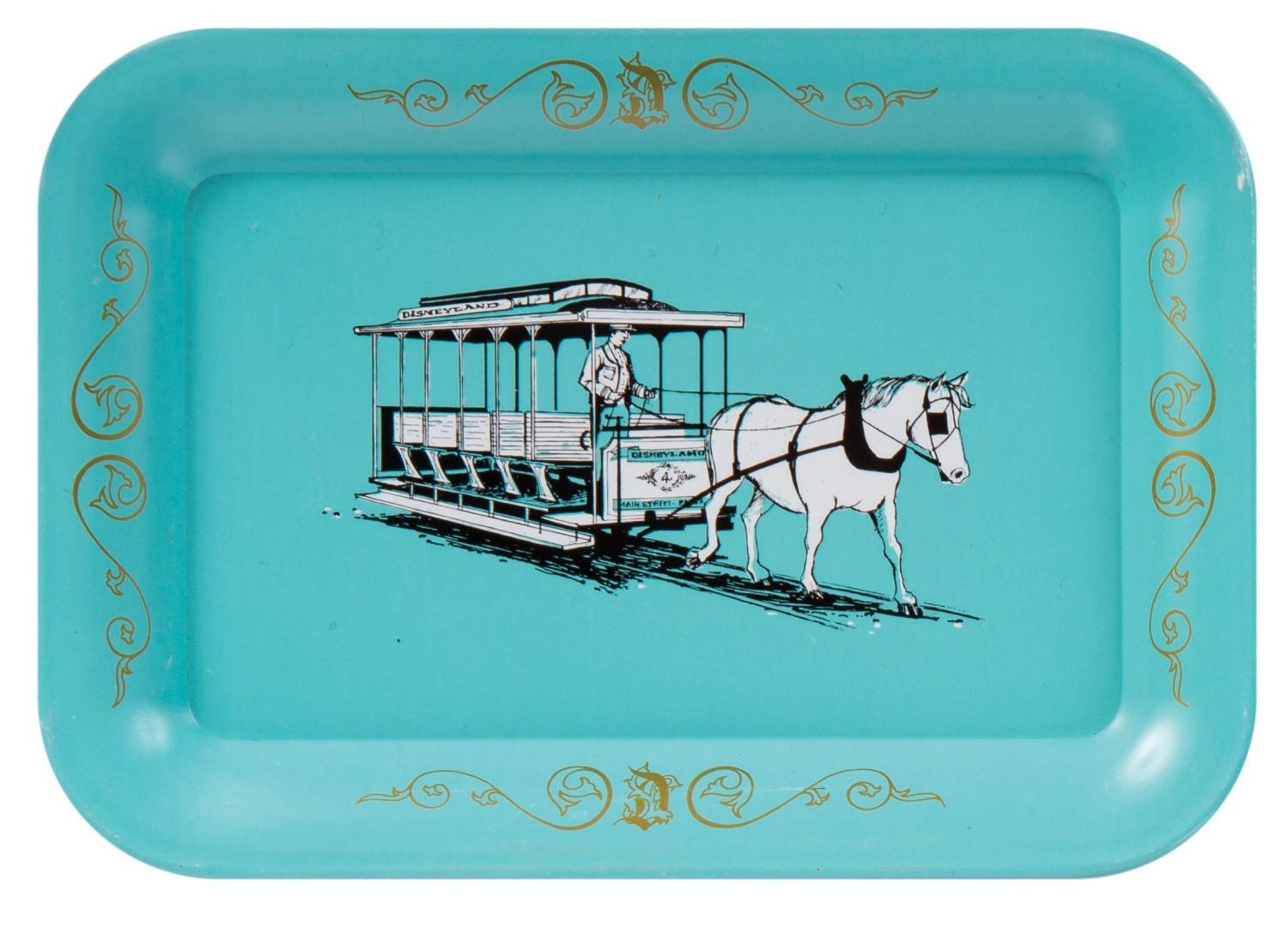 (Disneyland, c.1950s) A set of (4) tin horse-drawn streetcar souvenir tip trays from Disneyland. Each tray has matching imagery of the streetcar, the most popular of the turn-of-the-20th-century attractions, in various colors. Measuring 4.75"x6.75" each, the trays display in good overall condition, exhibiting only very minor scratches and denting.